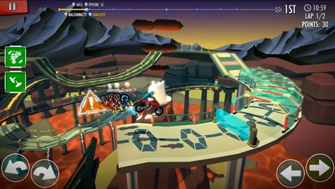 La différence qu’il faut voir étant la barre de progression au-dessus qui affiche la position et le classement qui n’existe pas dans Gravity Rider Zero. Les flèches et icônes vertes sont la représentation des boutons exclusifs à Android vu qu’on n’utilise pas de manette. Malheureusement il n’y pas plus d’information sur le « pourquoi deux versions ? », donc ce mystère ne sera pas résolu ici.