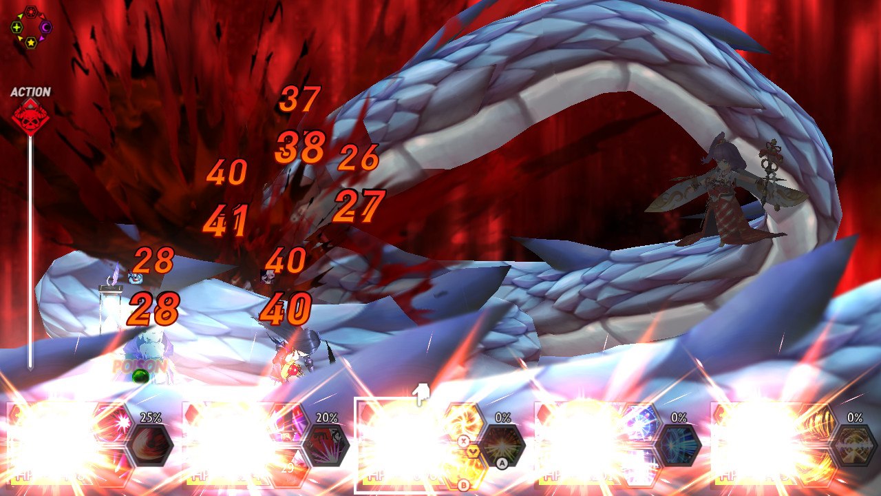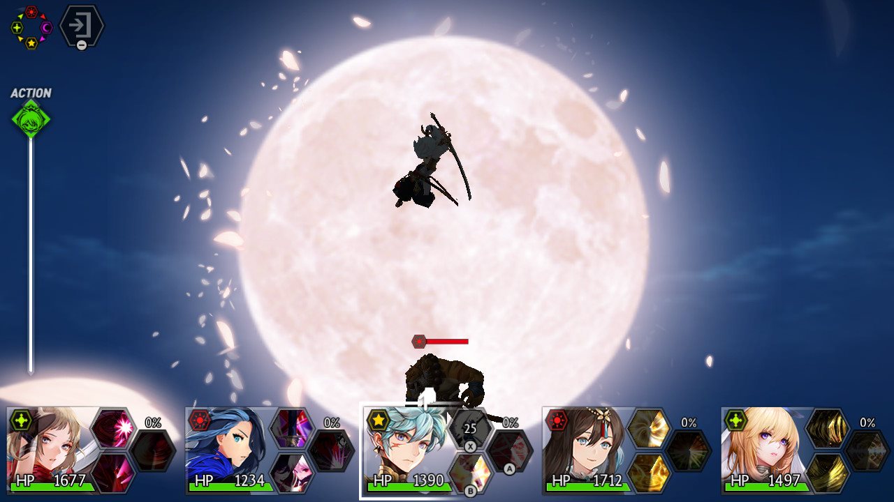 Le jeu étant un JRPG, il propose donc un système de combat en équipe et au tour par tour. Afin de dynamiser les combats, un système de « temps » réel a été mis en place par les développeurs. En effet, sur la gauche de l’écran, nous avons un axe sur lequel des icônes rouge et vert défilent en temps réel sans faire de pause. Une fois une icône arrivée en haut de cette barre, une action est effectuée : vert pour le tour du joueur et rouge pour le tour du monstre. Une alternance de vert et de rouge marque donc le combat sauf si l’un des camps est complètement étourdi par son ennemi grâce à une attaque du type opposé à celui de l’adversaire.