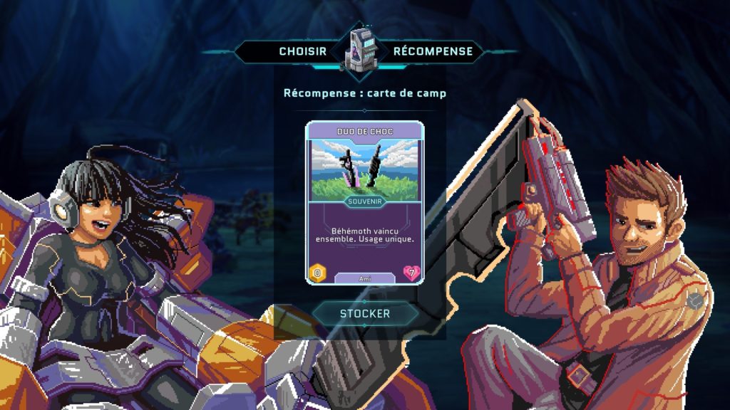 La patte graphique et la bande son sont bien évidemment les gros points fort du jeu. Star Renegades s’appuie sur un pixel art plutôt rétro et aux couleurs bien flashy, et même si le travail des graphistes reste en soi assez minimaliste, il est difficile de rester de marbre avec l’ambiance visuelle et sonore que nous offre le jeu. Les graphismes pixélisés sont plutôt bien travaillés et les animations entre les personnages lors des dialogues sont réussies, même si quelques fautes de traduction et d’orthographe perdurent dans les lignes de dialogues. Mais la bande son … quelle merveille ! Le rythme électro des musiques est un véritable plaisir pour les oreilles ! Chaque thème accompagne parfaitement l’action qui se déroule sous nos yeux et nous pouvons dire que le sound design assure énormément durant les combats !