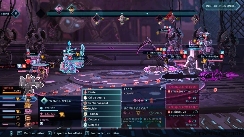 Vous vous en doutez bien qu’avec autant d’éléments à gérer, les combats sont donc très stratégiques ! A noter que les ennemis possèdent des forces et des faiblesses qu’il vous faudra connaitre afin d’en tirer profit. Mais rassurez-vous, si le système de combat se veut très complexe, il n’en est pas détestable non plus : les interfaces sont claires et ergonomiques, vous permettant de comprendre les enjeux du combat ainsi que les décisions importantes qui s’imposeront. Un autre point incontournable des phases de combat, la timeline ! Chaque action sera déterminée à l’avance sur une ligne de temps qui représente un tour. Un fin stratège comprendra très vite qu’il faut prendre le dessus sur les unités adverses en attaquant avant elles, vous permettant ainsi de délivrer un coup critique qui aura des effets supplémentaires selon l’attaque (bonus de dégâts en plus, dégâts d’armure, ralentissement des ennemis etc.).