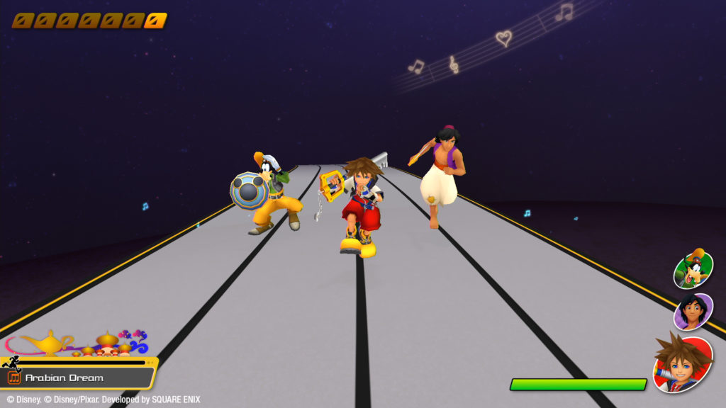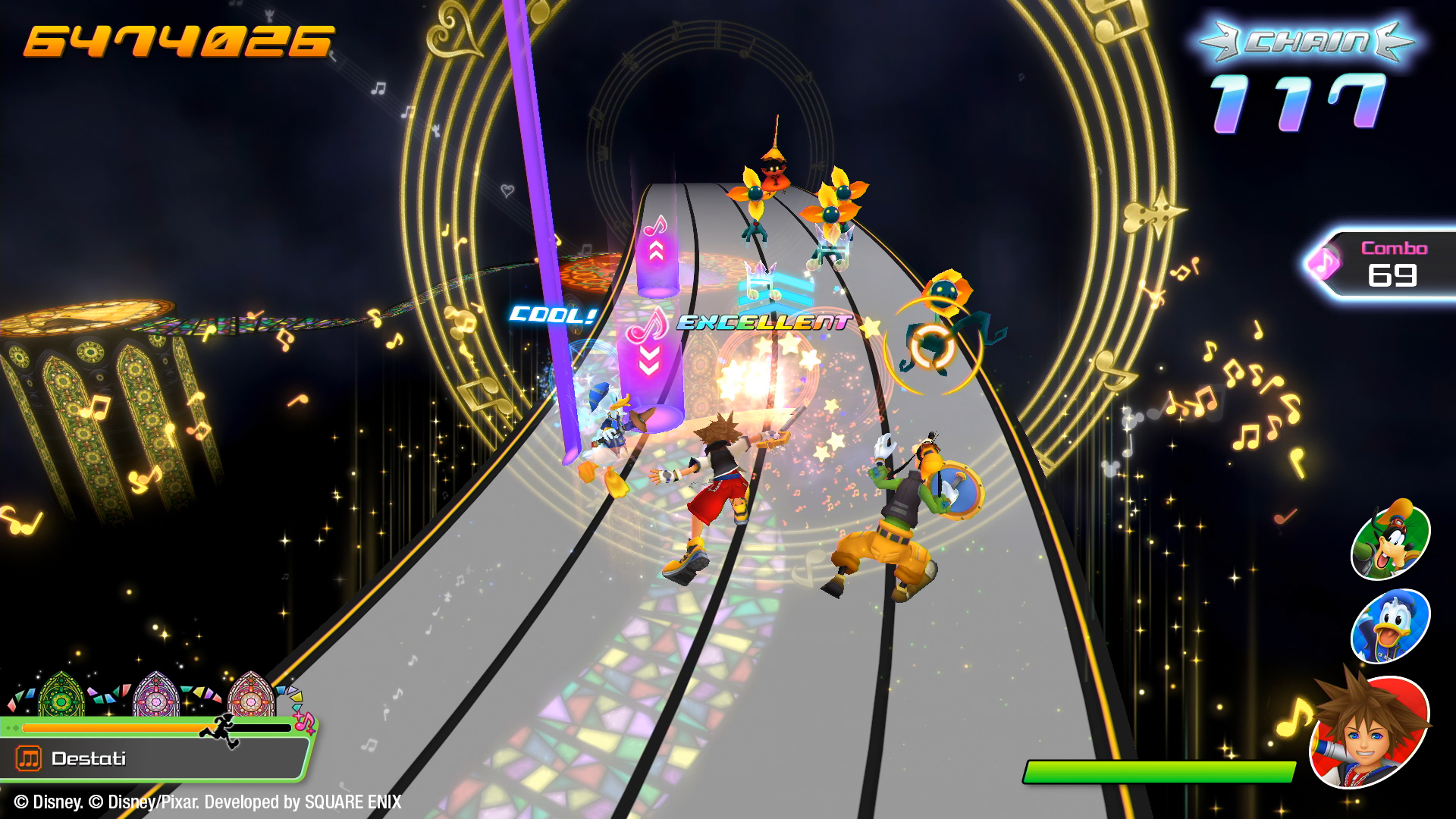 La prise en main est compliquée, mais on la surmonte assez facilement. Concernant la musique, c’est là où le bât blesse. Les musiques de KH sont de qualité, mais le jeu a voulu les tronquer, beaucoup trop même. Par exemple sur Simple and Clean en mode classique, le jeu coupe carrément la chanson pendant un mot … c’est quand même très dommage. Il s’agit d’un gros reproche global, tous les morceaux sont très court.