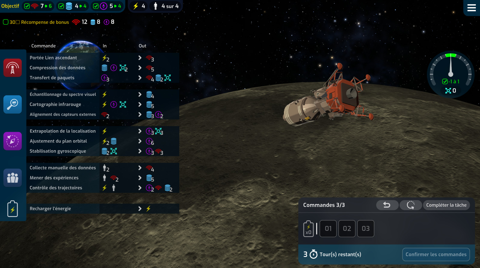 Par exemple, nous devons récolter 5 unités de communication, 4 de données et nous avons de base 3 unités d’énergie. Pour obtenir les unités nécessaires, nous avons :