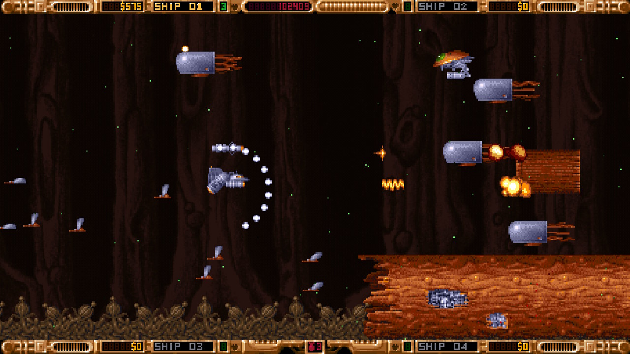 Durant nos missions, nous gagnerons de l’argent en ramassant des items dédiés et lâchés par les ennemis tués. Ils sont représentés par de petits cristaux et suivant leurs couleurs, nous pourrons amasser de vingt-cinq à cent cinquante pièces d’un coup, échelonnées par tranche de vingt-cinq. Dans 1993 Shenandoah, la monnaie ne nous servira pas qu’à acheter des vaisseaux. Il est possible d’équiper ces derniers avec des modules et, suivant la classe de notre engin, nous pourrons en ajouter de deux à quatre. Ces modules sont dotés de canons divers et variés que nous pourrons placer au-dessus, au-dessous, devant ou derrière le vaisseau et il y en a plus d’une vingtaine. Toujours moyennant finances, chaque vaisseau et module peuvent évoluer de trois niveaux. Il est possible de farmer de la monnaie à volonté et ainsi de s’acheter l’intégralité de ce que propose la boutique, puisque le jeu sauvegarde notre progression et qu’il est possible de rejouer les tableaux autant de fois que nous le voulons, même après avoir fini le jeu. Plus nous jouons, plus nous nous équipons et plus c’est over-cheaté, mais ce n’est pas pour nous déplaire. En revanche, il n’est pas possible de s’équiper jusqu’aux dents en mode facile pour revenir tout dégommer en mode hardcore, puisque le mode de difficulté est choisi au moment de la première sauvegarde. En plus de faire nos Crésus de l’espace, d’autres items sont récupérables durant nos bastons spatiales ; cela reste classique avec des bombes, des upgrades, ou de la recharge de boucliers. Ces derniers sont représentés par de petites boulettes blanches, qui disparaissent à chaque impact, formant un arc de cercle plus ou moins grand suivant le type de vaisseau. Il protège des petites blessures, mais pas des gros lasers et autres armes sadiques que l’on peut trouver dans tout bon shump qui se respecte. Autre point qui intéressera les high-scorer, il y a cinq ennemis qui donnent des bonus de points au bout d’un certain nombre d’entre eux, éliminés à la chaîne. Enfin, pour en finir avec les loot et le gameplay, il est possible de jouer à 4 simultanément et comme pour pimenter les parties muliplayers, l’argent récolté ne tombe pas dans un pot commun.