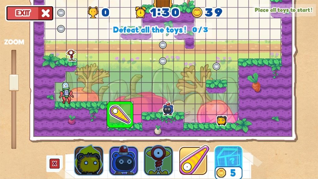 Concernant le gameplay, après le « exit » de la partie dessin, les développeurs de Digital Continue, sans doute sous l’influence d’un Mario Maker, ont ajouté une dimension puzzle aux phases de plates-formes. Pour avancer dans l’histoire, il faudra enchaîner des groupements de 3 niveaux. Ceux-ci sont généralement découpés de cette façon : 1) découverte d’une nouvelle feature tel qu’un nouveau type d’ennemi ou un nouveau gimmick tel que le saut mural. 2) même chose, mais en plus dure. 3) un éditeur de niveau sur lequel il faudra ajouter quelques items pour pouvoir espérer atteindre la sortie. Apparaît alors un quadrillage sur lequel nous pouvons déposer monstres et objets spéciaux.