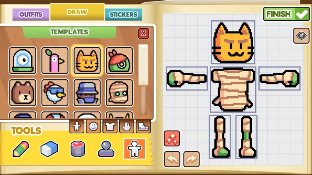 Développons un peu : dans Drawn to Life, dès le début de l’aventure, nous avons la possibilité de personnaliser notre avatar. Pour cela, il est possible de dessiner 6 parties distinctes – les bras, la tête, le tronc et les jambes – qui seront par la suite animées. Okay, c’est une super idée non ? Mais comment nous débrouillons-nous pour dessiner au stick ? DESSINER AU STICK !!!! Alors que la Switch a un écran tactile ! Comment imaginer un jeu, à l’origine basé sur le dessin, sans possibilité de dessiner ? Parce que soyons honnête, il est strictement impossible de dessiner au stick, à moins d’être un adepte du pointillisme bien sûr. (Vous chercherez sur le ternet et vous me ferez une rédaction de 5 pages sur le sujet !)