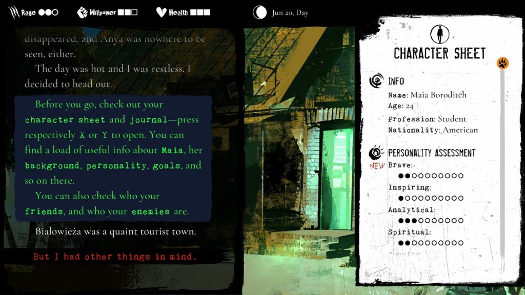 Dès le prologue de notre aventure, nous en apprenons un peu plus sur les mécaniques de jeu. Sous la forme d’un rêve assez court, nous nous voyons expliquer le système de rage et de volonté. Nous pouvons en stocker des points et lorsque ceux-ci sont suffisamment hauts, ils débloquent des embranchements spécifiques. À nous de dépenser ces points comme nous le souhaitons. C’est très intuitif et cela permet d’adapter l’histoire à nos envies. Ferons-nous de Maia une impétueuse bagarreuse ou une jeune fille réfléchie et timide ? À nous de voir.
