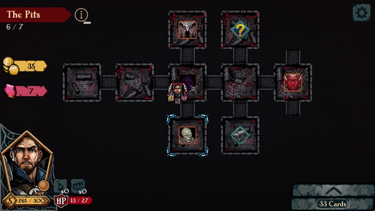 En dehors c’est un Roguelite fort classique et robuste. On avance sous forme d’un jeu de plateau ou les salles se dévoilent au fur et à mesure de la progression. Assez classique, vous aurez des salles qui contiennent des monstres, des monstres élites, des trésors, un forgeron pour augmenter vos cartes, un temple pour récupérer de la vie ou encore un magasin.