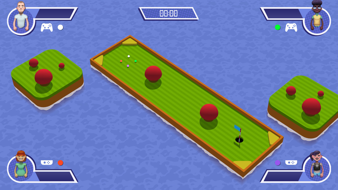 Nous n’avons pas trouvé de réel bonus à cela à part nous énerver haha. Le mode Solo se joue sur 3 difficultés. Facile, normal et difficile. Chaque parcours a son petit plus divisé en 4 catégories : parcours débutant, avancé, folie ou super parcours. Vous allez devoir tout débloquer en jouant évidemment. En ce qui concerne les règles, ce sont celles du mini-golf en général, mettre la balle dans le trou en un minimum de tir tout simplement. Pour finir, lorsque vous jouez solo, vous avez quand même la possibilité de rajouter des “potes” à Barry qui joueront contre vous. Ils ont des têtes bizarres ce qui vous donnera peut-être l’envie de leur mettre une raclée, vous comprendrez pourquoi nous disons ça si vous achetez le jeu.