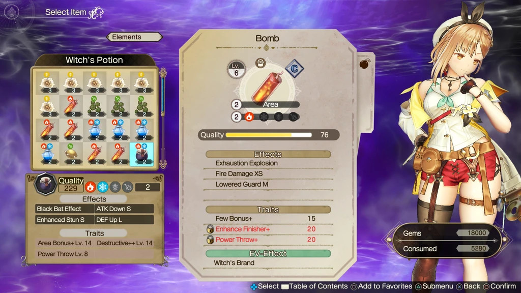 Après vous être amusés à déforester la flore et à tabasser la faune, vous rentrerez à la capitale les poches pleines, prêts à faire de l’alchimie dans votre Atelier devenu appartement. Ryza est arrivée dans la capitale un peu les mains vides et on comprendra qu’il est compliqué d’emporter dans un bateau tous ses outils acquis depuis les trois dernières années. Pour compenser, le jeu propose un arbre de compétences qui vous permettra de récupérer une bonne partie des recettes que vous connaissiez déjà sans avoir à tout réapprendre. Pour les débloquer, vous devrez progresser dans l’histoire et réaliser des quêtes d’habitants. De plus, vous gagnez des points de compétences à chaque objet synthétisé, ce qui vous donnera de quoi dépenser sans compter. La point négatif ici est que l’arbre est grand et que vous n’êtes pas guidés des masses. Vous ne serez jamais vraiment bloqués si jamais vous vous trompez car les points de compétences se gagnent facilement, mais vous devrez faire vos propres expériences pour savoir quoi augmenter en premier. Au niveau des synthèses, le fonctionnement est identique au premier opus mais a été bien simplifié sur quelques détails techniques. Chaque objet que vous allez créer va vous demander plusieurs ingrédients sous la forme de boucles élémentaires. Chaque boucle va vous demander un type de composant ainsi qu’une couleur élémentaire (par exemple, un composant de type minerai avec un élément de feu). Chacune des boucles va apporter une spécificité ou un effet à l’objet final en augmentant sa qualité au passage. Les objets que vous allez synthétiser vous serviront pour vos quêtes ou pour améliorer d’autres objets. Vous devrez faire en sorte de toujours avoir la meilleure qualité possible (sauf si vous devez les donner) pour en tirer le meilleur parti. Tout comme dans le premier opus (en débloquant la compétence associée dans l’arbre), vous pourrez synthétiser des objets à partir d’autres afin d’élargir le champ des possibles et obtenir de meilleurs outils, armes et équipements. Le jeu n’est pas avare en tutoriel et vous aidera à prendre en main chaque nouvelle découverte, chaque nouvelle compétence. La seule limite, c’est vous.