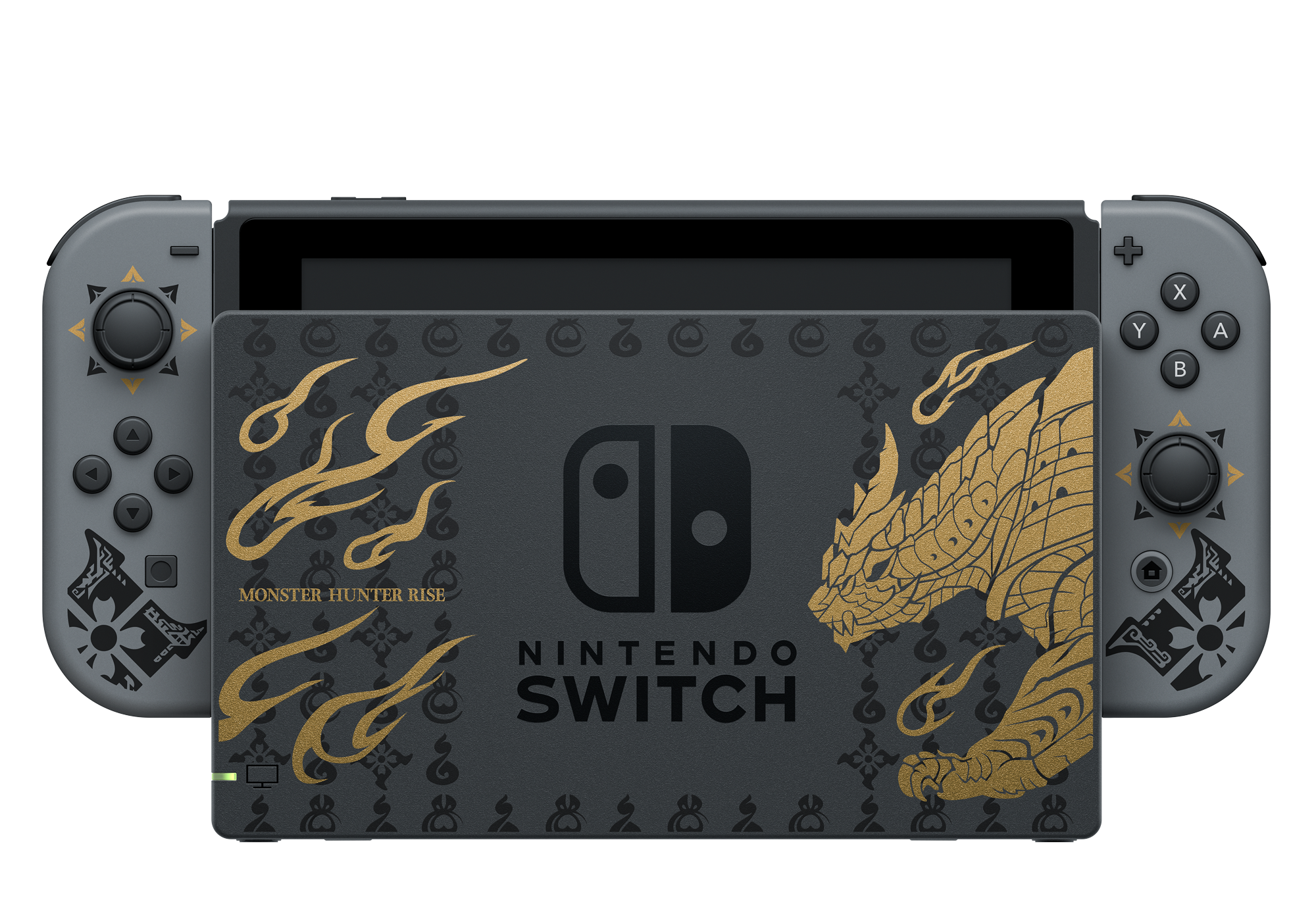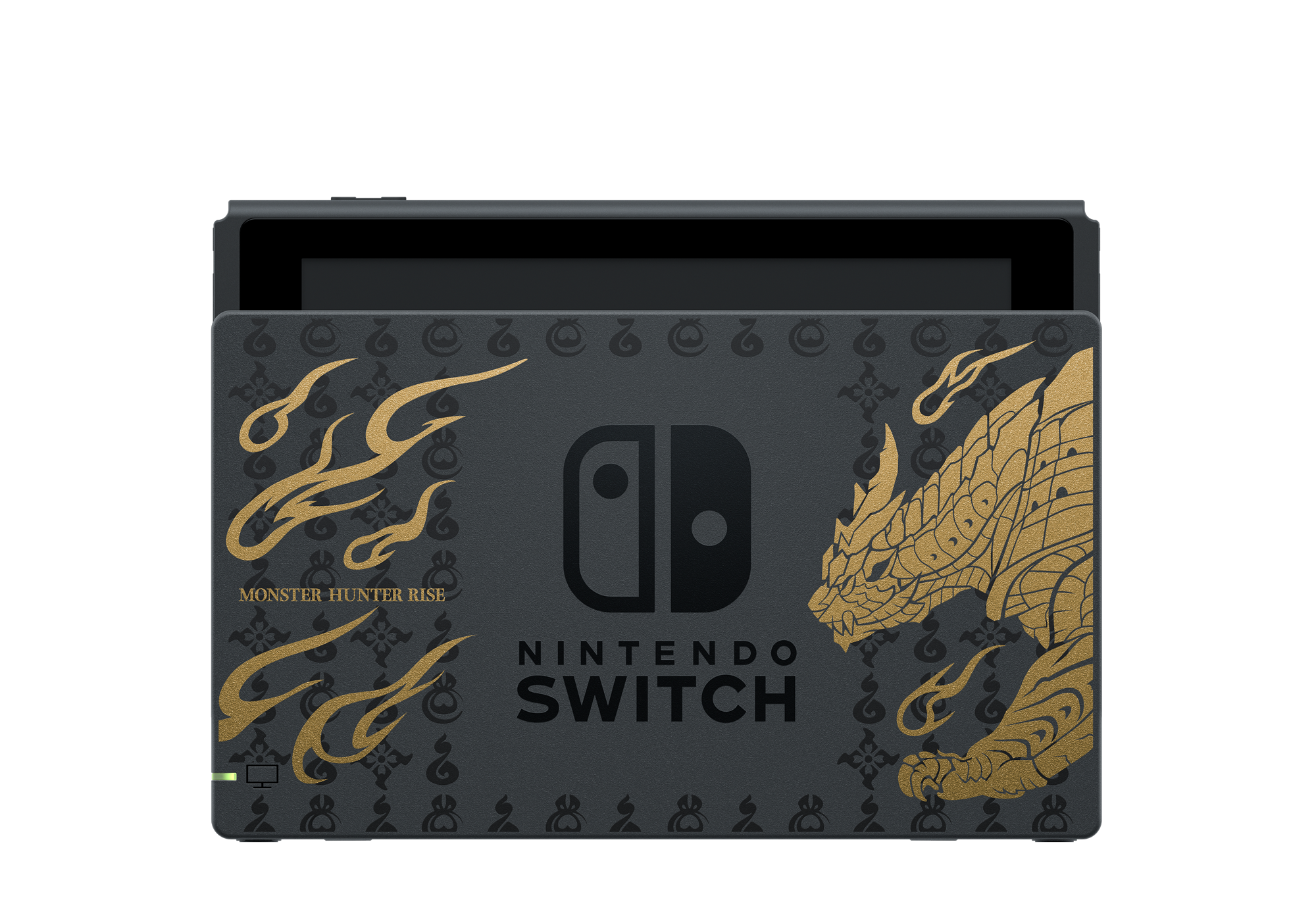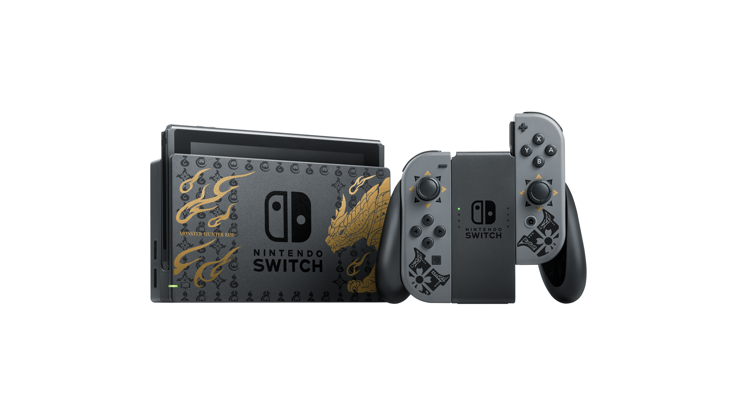 La Nintendo Switch™ édition MONSTER HUNTERcomporte une illustration du monstre emblématique du jeu,Magnamalo, sur la station d’accueil, ainsi que des motifs caractéristiques de MONSTER HUNTER RISE décorant la console et les manettes Joy-Con. Elle contient également un code de téléchargement pourMONSTER HUNTER RISE, le DLC du kit deluxe* et un contenu bonus**.La manetteNintendo Switch Pro édition MONSTER HUNTER RISE™, vendue séparément, dispose également d’un design rappelant Magnamalo.