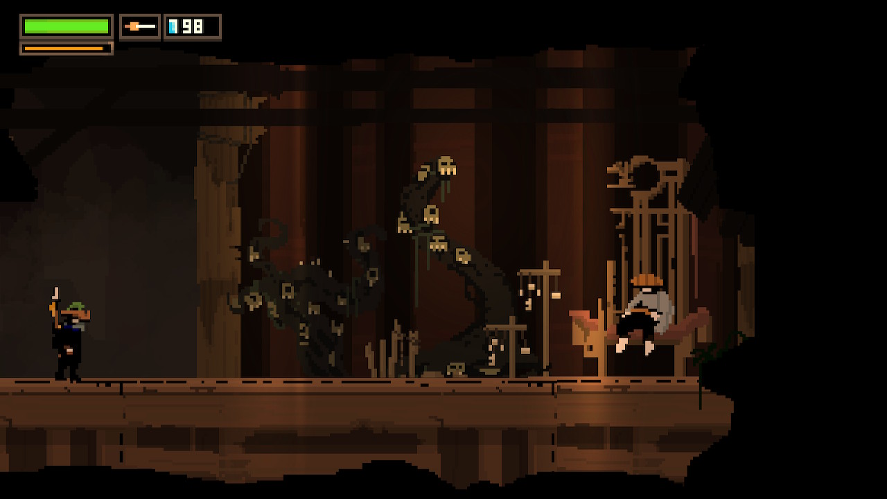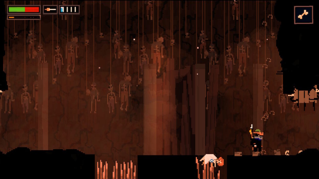 Comme dans tout jeu de plateforme-action qui se respecte, nous disposons d’un arsenal que nous trouverons au fur et à mesure que nous progresserons dans l’aventure. Nous le disions plus haut, en premier lieu, ce sera la rapière qui nous permettra d’infliger des coups aux dégâts plus importants qu’au corps-à-corps. Ensuite viennent les armes qui auront besoin de munitions que nous pourrons trouver ou fabriquer  : l’Arbalète à répétition qui tire des flèches à raison de trois successivement avant d’avoir besoin d’être rechargée et le Tromblon, sorte de fusil à pompe du XVIIe siècle qui nécessite d’utiliser des cartouches de poudre à canon. Puis, nous avons également trouvé la pierre d’orage qui permet de canaliser la foudre pour électrocuter nos ennemis.