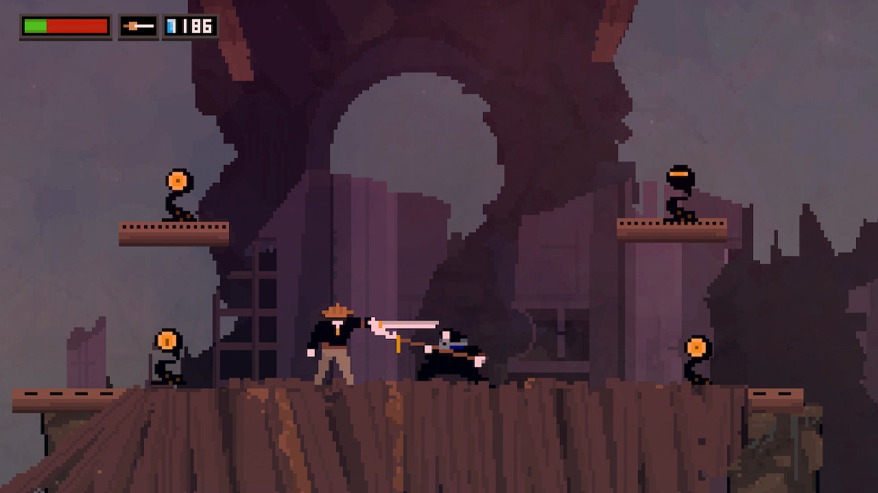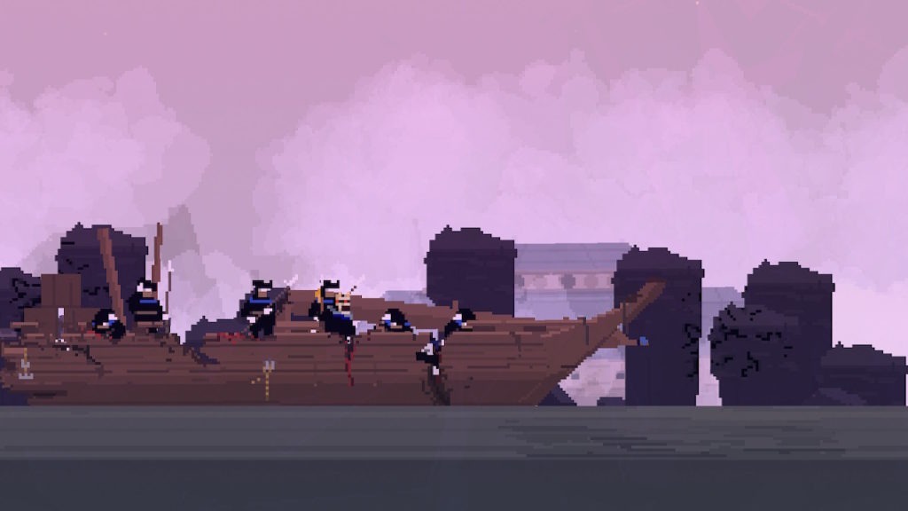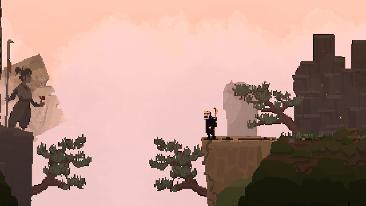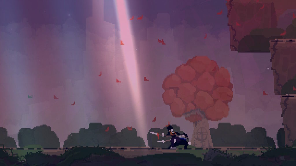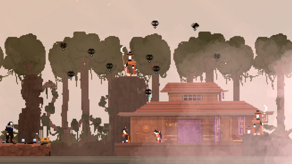 Ceux qui ne sont pas sensibles au pixel art trouveront que le jeu est un jeu mal fait, avec des graphismes primaires, sans détails ni expressions de visage. D’autant plus qu’il s’agit d’un format 4-bit, notamment pour les personnages. Dans le cas d’Olija, nous pensons que nous sommes bien sur la notion artistique du format et non sur une énième tentative de faire chavirer le cœur de quelques vieux joueurs nostalgique d’une ère révolue. D’ailleurs, un excellent travail a été exécuté par Thomas OLSSON et son équipe, sur les décors et les toiles de fond ; beaucoup de détails pour un style graphique, mais aussi des animations à mi-chemin entre l’époque des conquêtes marines britanniques et un genre de « swashbuckler » à la sauce orientale. À plusieurs reprises, nous avons participé à des combats épiques organisés pour le bon déroulement du scénario à la façon des meilleurs films de sabre japonais, un pur régal. La composition sonore et le sound design ont également été magnifiquement, minutieusement, travaillés par Thomas et Maxime OLSSON.