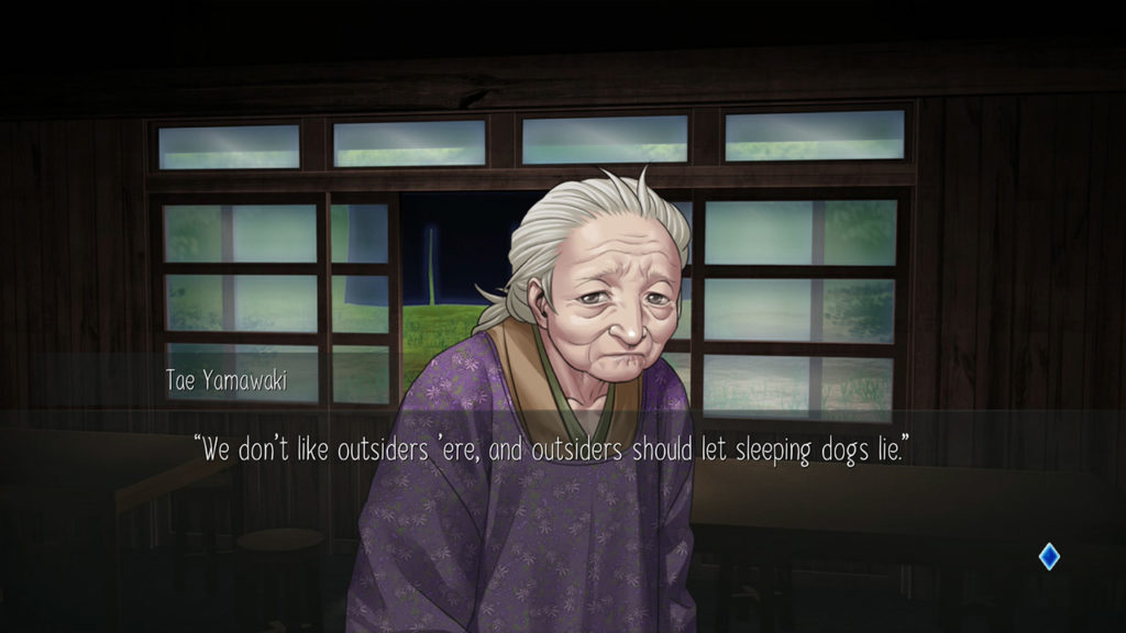 Après nous avoir hébergé une nuit en nous offrant à manger et quelques bières, elle nous incite le lendemain à fuir le village de Yasumizu. Chiemi insiste sur le fait de limiter nos échanges avec les quelques habitants du village qui ne semblent de toute façon pas apprécier la présence d’un étranger sur leur territoire. Ceux-ci semblent même très enclins à nous aider à réparer le véhicule afin de nous faire partir au plus vite. Alors que nous faisons brièvement connaissance avec la petite quinzaine d’habitants et de deux journalistes étrangers arrivant tout juste à Yasumizu, une étrange brume rouge commence à envelopper le village en début de soirée.