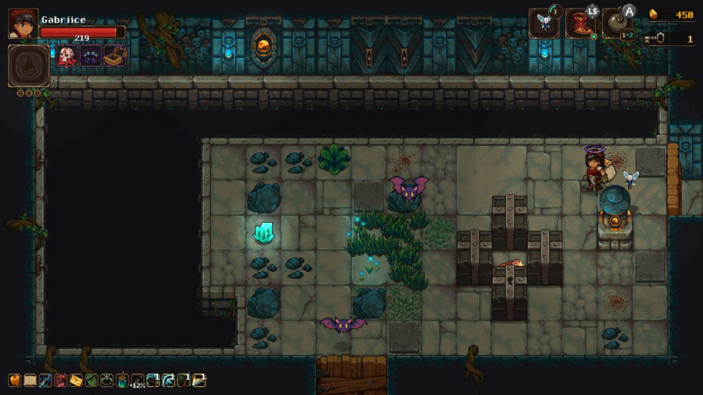 Le nombre d’ennemis différents n’est pas énorme, mais il est bien suffisant. Vous allez avoir des variantes de ces derniers au fur et à mesure de votre descente dans la mine. Si certains ont des patterns simples : le rat vous fonce dessus, le gluant saute pour retomber sur vous, d’autres vont être plus compliqué à maîtriser. Souvent, les patterns ne sont pas compliqués, mais la multiplicité des ennemis différents dans la même pièce, voire même du même type rend vite le tout très bordélique et compliqué. Mais c’est ce qu’on aime dans un Roguelite !