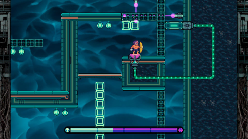 L’originalité d’Even the Ocean est que le joueur peut gérer sa barre de vie/pouvoirs comme il entend. Cette barre se présente en effet comme une double jauge partagée entre deux couleurs. En touchant une plante (pourpre ou bleu), la couleur correspondante augmentera sur notre jauge. En ayant par exemple une majorité de pourpre, notre Aliph gagnera en vitesse. Une majorité de bleu et elle pourra faire un bond spatial ! En revanche, si par malheur, notre barre est entièrement remplie par une des deux couleurs, c’est le game over.