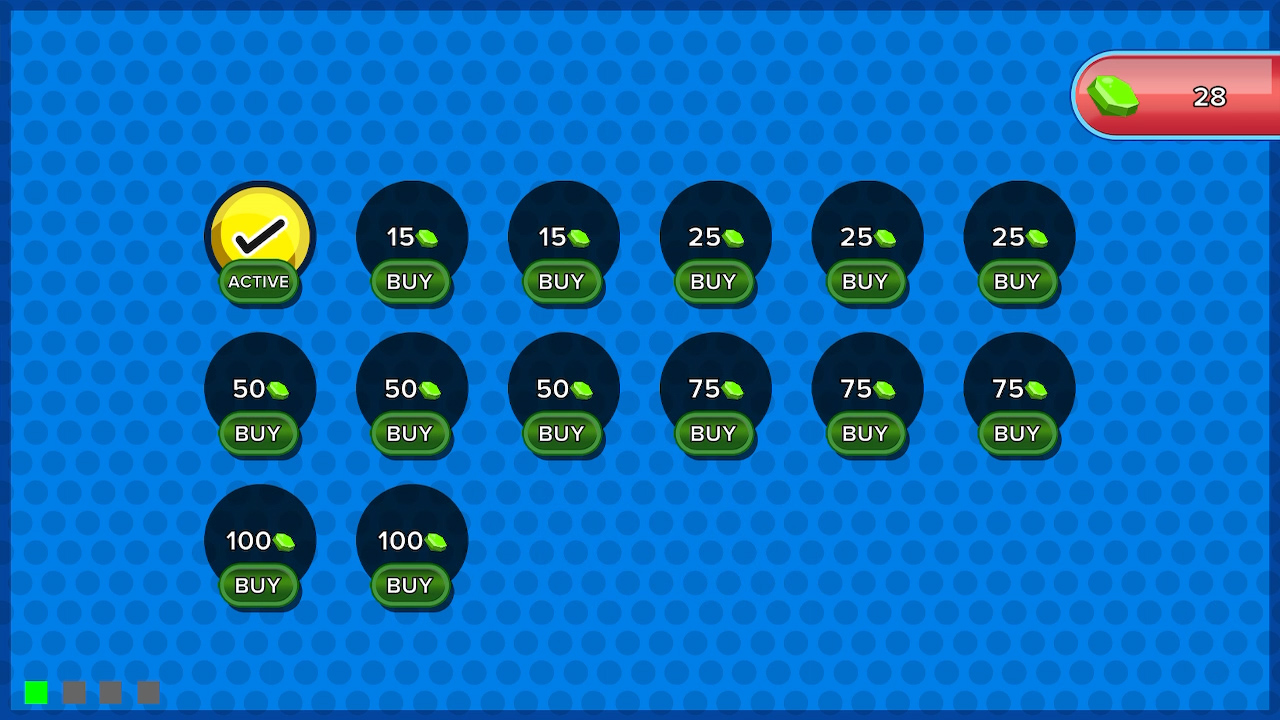 Chaque partie vous fera gagner des émeraudes, ces dernières sont à dépenser dans le menu “Tokens” et vous permettent de débloquer des skins pour vos pièces. Au total 13 skins sont à débloquer, sans compter les pièces jaunes et rouges par défaut, de quoi apporter un léger intérêt à enchaîner les parties.