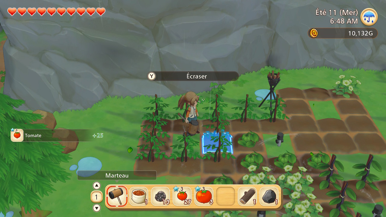 Les améliorations d’outils permettent de dynamiser ce gameplay et les différents crafts disponibles de décorer sa maison ainsi que ses champs un peu comme un Animal Crossing en plus simple, mais qui permet néanmoins de faire de très jolies choses : bancs, coffres, barrières, buissons sculptés…