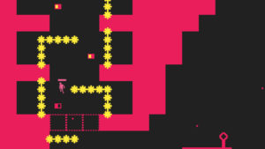 Le structure du jeu rappellera des jeux d’arcade vu qu’on nous envoie direct dans l’action en introduisant les mécaniques du jeu dans les niveaux sans explication. Pinkman peut seulement sauter, utiliser un jet pack d’une courte durée et changer de point de vue de façon à voir tout le niveau ce qui permettra de savoir à quoi s’attendre. Le level design va constamment évoluer, tous les 5 niveaux un nouveau piège dans le niveau sera introduit qui ressemblera plus à une mécanique de jeu. Les pièges sont nombreux allant d’un fantôme qui nous poursuit à des tourelles à tir rapide ainsi que les célèbres piques. Vous aurez de nouvelles mécaniques de niveau tels qu’un téléporteur ou de l’essence pour vous maintenir plus longtemps en l’air avec votre jet pack. Les surprises seront nombreuses mais toujours intéressantes. Le jeu évolue tellement qu’on n’a pas le temps de s’ennuyer en plus à chaque mort la couleur du niveau change, cela maintiendra l’intérêt après chacune des nombreuses morts (il y a 16 variantes de couleur).
