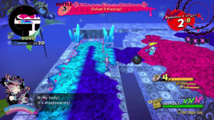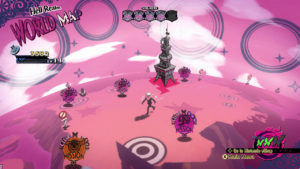 Le jeu suivra toujours plus ou moins le même déroulement, vous discuterez avec Poisonette, puis vous choisirez un enfer à purifier. Chaque enfer correspond donc à une âme en peine (morte ou vivante), qu’il faudra libérer de ses idées noires (matérialisées par le poison et les Kleshas, des démons des enfers). Vous évoluerez donc dans des zones assez simples, sortes de plateformes suspendues dans des environnements aux couleurs vives, tirant vers le rose ou le violet (c’est très très flashy). Au fur et à mesure de votre progression, vous devrez nettoyer la zone en mode Poisonette ou en mode shoot. En effet, dans certains cas, il faudra nettoyer des zones de slime rose au sol. Si votre personnage marche dessus, il perd des points de vie.