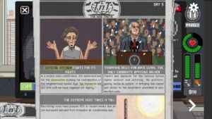 Mais petit à petit, à force de nouvelles parties et de retour sur des cages déjà connues, nous parvenons à arriver jusqu’au 16ème jour, jour de délivrance qui, en fonction de nos réussites et de notre niveau d’éthique, se conclura différemment. Pour arriver jusque-là, en plus de la possibilité de faire chanter les uns tout en sauvant les autres, il sera aussi possible de trouver un petit job pour se maintenir à flot financièrement. C’est certes pratique, mais cela entraîne une perte de temps qui pourrait nous empêcher d’assister à des événements importants, d’autant plus que le cycle jour/nuit a une importance dans la vie de nos singes. Le choix sera dur et faire le choix de l’argent facile n’en sera que plus attrayant.
