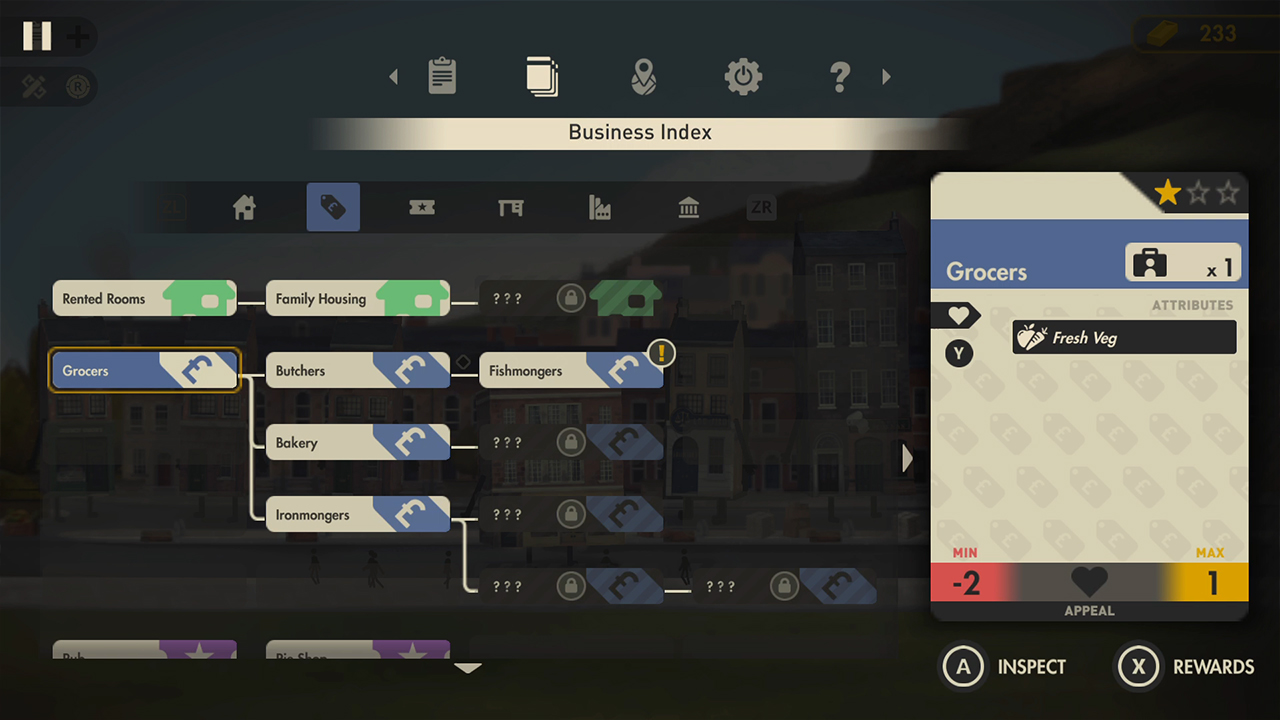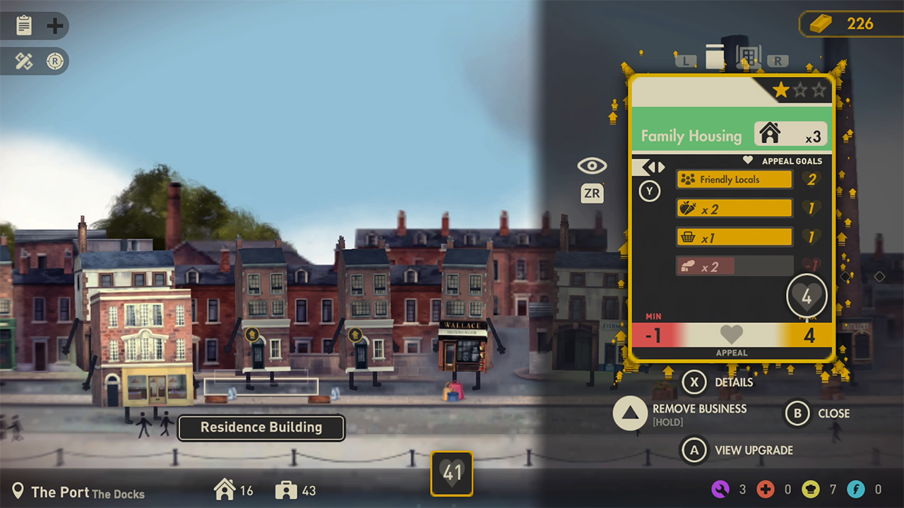 Il faudra constamment gérer le type de bâtiment, sa fonction ainsi que sa position. Une fois la technique comprise, le titre des développeurs irlandais se montre plutôt profond et offre de multiples façons de se sortir des situations proposées. La gestion est toujours au centre de nos préoccupations. Ces améliorations nous permettront de débloquer de nouveaux types de locaux, permettant de booster encore un peu plus l’attractivité de notre quartier.