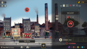 Techniquement parlant, la première chose qui choquera sera le loooong temps de chargement pour débuter une partie. Une fois la partie lancée pour de vrai, les décors en 2d rendent hommage au monde urbain du début du 19ème siècle. Les bâtiments en briques vivent dans un paysage changeant en fond de scène. Des quais gris et sombres jusqu’aux hauteurs verdoyantes de la ville, c’est toujours agréable à regarder. Les buildings changent d’apparence en fonction de leur rôle et apportent aussi une grande variété graphique.