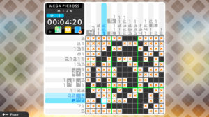Le mode Mega Picross est plus difficile que le mode classique, vous aurez là encore 150 nouveaux Picross à résoudre, mais cette fois-ci les règles sont plus complexes, vous n’aurez pas un indice pour une colonne/ligne mais parfois pour deux d’un coup, par exemple si l’indice 7 apparaît sur deux lignes il faut alors que 7 cases soient grisées à la suite sans casser la chaîne mais cette fois-ci sur deux lignes, c’est souvent bien plus difficile à déduire !