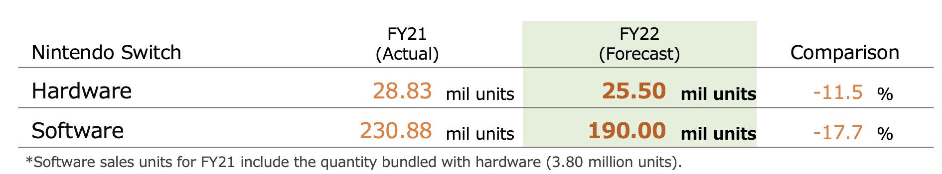 Nintendo s’attend à ce que les ventes de consoles soient de 25,5 millions d’unités pour l’année fiscale en cours, soit une baisse de 11,5 % par rapport à l’année précédente. Les ventes de jeux  devraient atteindre 190 millions d’unités, soit une baisse de 17,7 % par rapport à l’année précédente. Un certain risque lié à la pénurie mondiale de puces pourrait entraîner une baisse des livraisons.