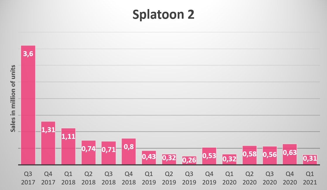 Splatoon 2 a ajouté 310 000 unités ce trimestre et totalise désormais 12,21 millions d’exemplaires dans le monde.