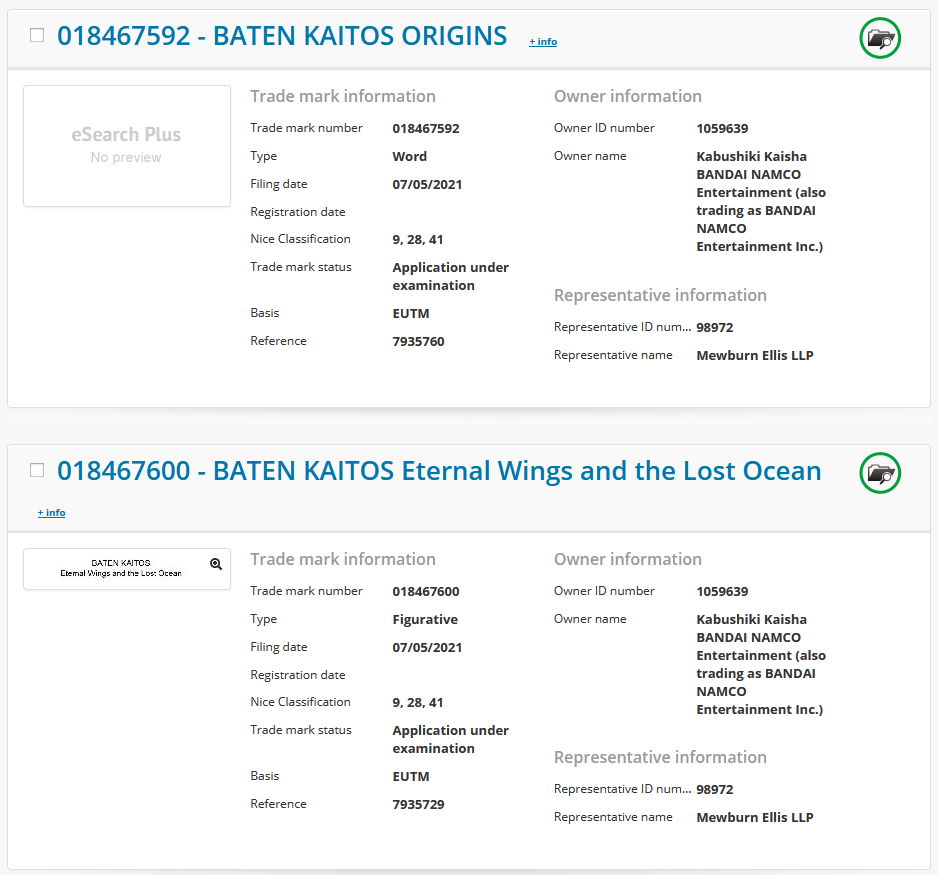 Amateur de JRPG sur Switch, il est peut être temps de reprendre vos Magnus, de commencer à les mélanger puis de préparer vos deck de cartes. Pour ceux qui ont connu la Gamecube, vous n’êtes pas sans vous souvenir du chef d’œuvre que fusse Baten Kaitos: Les ailes Eternelles et l’océan perdu. Le préquel Baten Kaitos Origins, tout aussi bon selon les dires, n’a pourtant jamais franchi les frontières US jusque chez nous. Faute à un timing plus que tardif avec une Gamecube sur la touche et une Wii sous les projecteurs du monde entier. On vous reparle de ces deux jeux tout simplement car Bandai Namco, détenteur des droits sur les jeux, vient d’enregistrer à nouveaux ces noms en Europe sur le site euipo selon Resetera. Une opération bien étrange s’il n’y a vraiment rien derrière. Une chose est sure, si Baten Kaitos HD Collection doit sortir un jour sur Switch, nous serons les premiers heureux de cette nouvelle avec vous, chers lecteurs. D’ailleurs, n’hésitez pas à dire en commentaire ci-dessous ce que vous évoque ce dépôt de titre. On vous laisse également ci-dessous le screen prit par les fans sur ce dépôt en question.