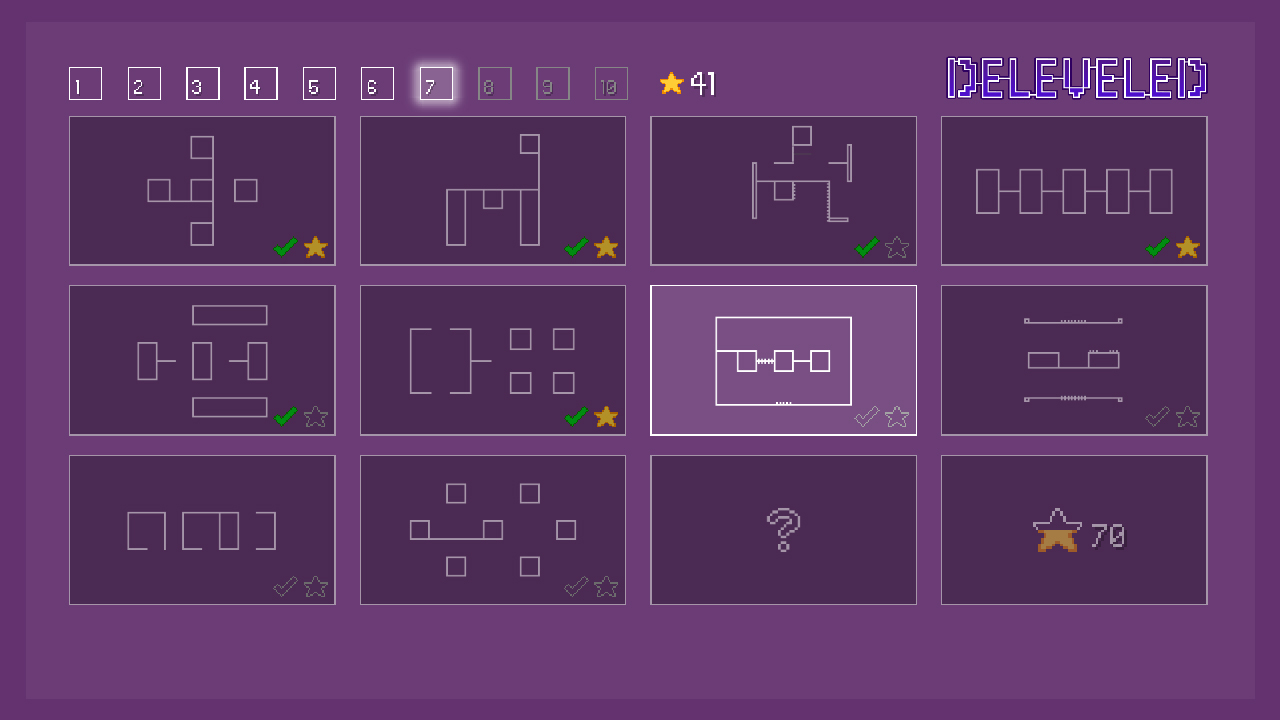 Deleveled est un jeu de casse-tête mêlant plateforme et stratégie aux graphismes minimalistes qui propose aux joueurs cent vingt niveaux au cours desquels leurs nerfs seront mis à rude épreuve.