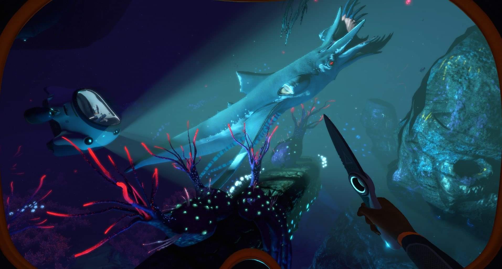 Subnautica Below Zero possède une direction artistique très agréable et complètement immersive. Avec une flore et un bestiaire varié, on sent qu’Unknown Worlds a mis le paquet pour nous proposer de nouvelles choses, tout comme les types de véhicules et l’alternance des phases d’exploration sous l’eau vs terre ferme. Progression et exploration sont également très bien dosées, mais la palme d’or revient à la bande son et à l’excellent éclairage des fonds marins. Ainsi au fur et à mesure que l’on descend en profondeur, ceux-ci vont créer une tension inspirant parfois la terreur, afin de vous rappeler que Robin n’est pas au sommet de la chaîne alimentaire. Si certaines zones sont très dangereuses et les possibilités de vous faire attaquer nombreuses, le jeu ne se veut aucunement punitif puisque mourir ne vous fera perdre que quelques objets. La difficulté et le sentiment d’anxiété que peuvent créer en vous certains biomes sont subtilement contrôlés, permettant ainsi aux plus sensibles d’entre vous de finir le jeu sans trop de soucis. Il est important de notifier l’existence d’un mode de survie hardcore où toute mort est définitive, pour les fans de défis.