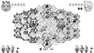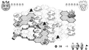 Le plateau du jeu est composé de cases hexagonales avec aux deux extrémités notre camp et le camp de notre adversaire. Entre les deux, la nature sauvage : des montagnes, des forêts, des marécages, des collines, mais aussi et surtout des monolithes noirs qu’il faut conquérir pour obtenir un petit boost de puissance. Tous ces éléments sont autant de contraintes à prendre en compte. Les marécages coûtent dix sous de plus pour y bâtir une construction. Mettre un moulin sur un champ de blé augmentera le rendement de notre moulin. Construire une tour de garde sur une colline lui confèrera une meilleure aptitude à se défendre et sera donc plus difficile à détruire pour l’adversaire.