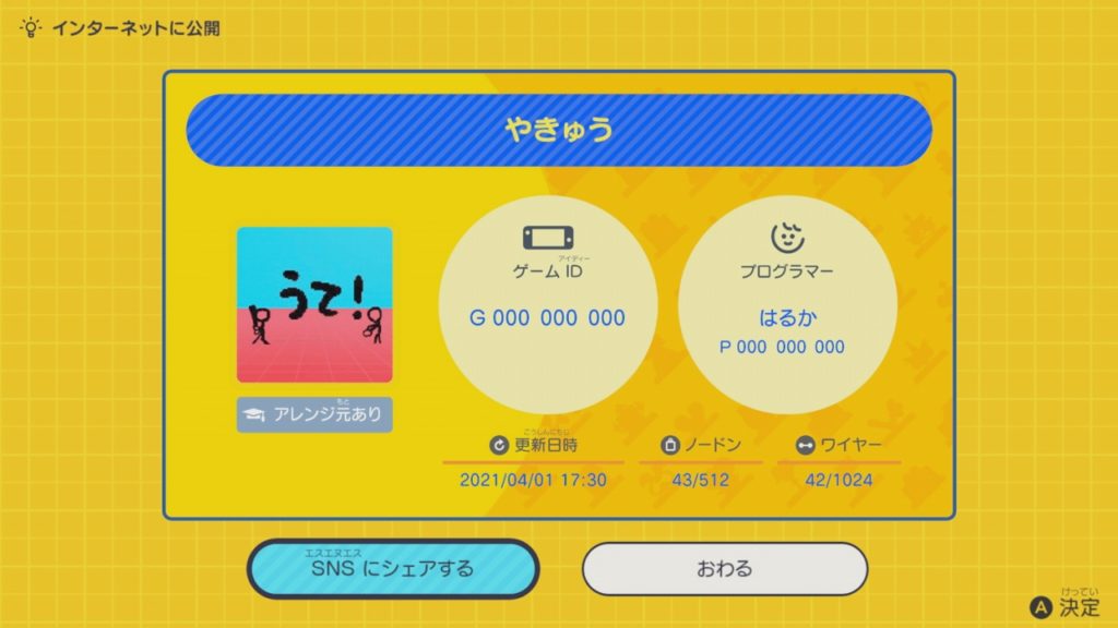 Si vous êtes en quête d’inspiration, il sera aussi possible d’échanger et recevoir les créations de vos amis et votre famille via Internet ou via le mode sans fil local*. Ce sera l’occasion parfaite de non seulement montrer vos plus belles œuvres, mais aussi de voir ce qu’a donné la créativité des autres utilisateurs. Il sera aussi possible d’observer l’envers du décor des jeux téléchargés dans le mode Programmation libre, pour voir comment les jeux mis en ligne par d’autres créateurs ont été conçus et peut-être même découvrir quelques nouvelles astuces !