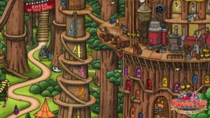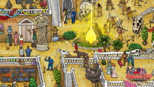 Chacun des dix niveaux a son propre style graphique, du musée à la ville en plein carnaval en passant par la forêt. Chaque lieu invite au dépaysement et renouvelle les codes graphiques des éléments que nous rencontrerons. Assez proche de la bande dessinée traditionnelle, nous pensons directement à ce que proposait Où est Charlie ? pour la patte graphique. C’est à la fois très touffu, tout en restant parfaitement lisible. Et dans le cas où nous, joueurs, serions perdus, une discussion avec l’un des mages disséminés sur la carte nous permettra de voir apparaître des flèches nous indiquant la direction à suivre pour atteindre l’objectif suivant.