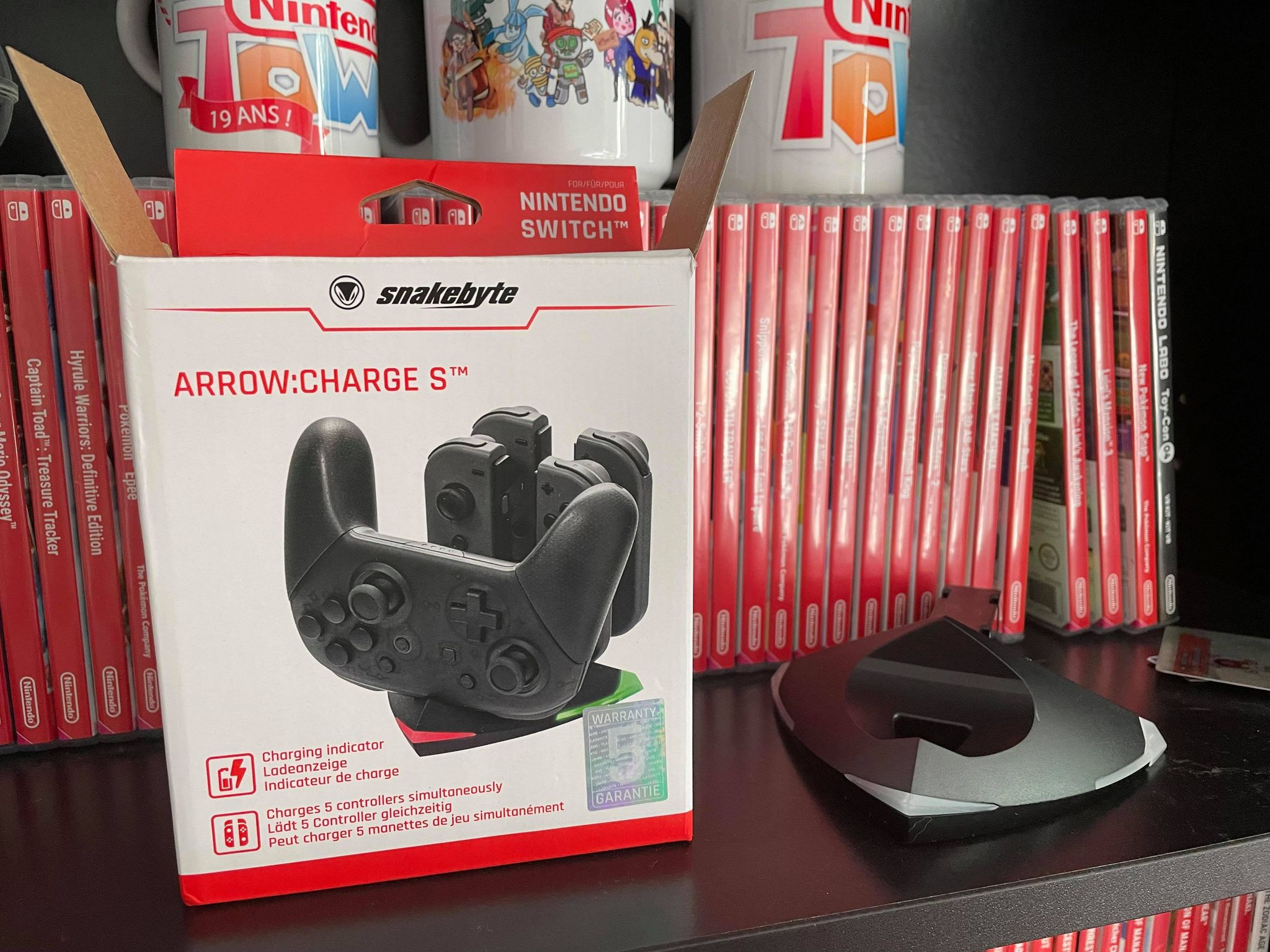 Présentation : Le ARROW:CHARGE S™ est un support de chargement (de type C) pour Nintendo Switch. Il peut charger simultanément 4 joy-cons et 1 Switch Pro Controller. Il bénéficie de 5 indicateurs LED d’état de charge. Il comprend un câble de recharge de type C d’un mètre de long, ainsi qu’un adaptateur de type C pour Switch Pro Controller. Prix conseillé : 17.99€
