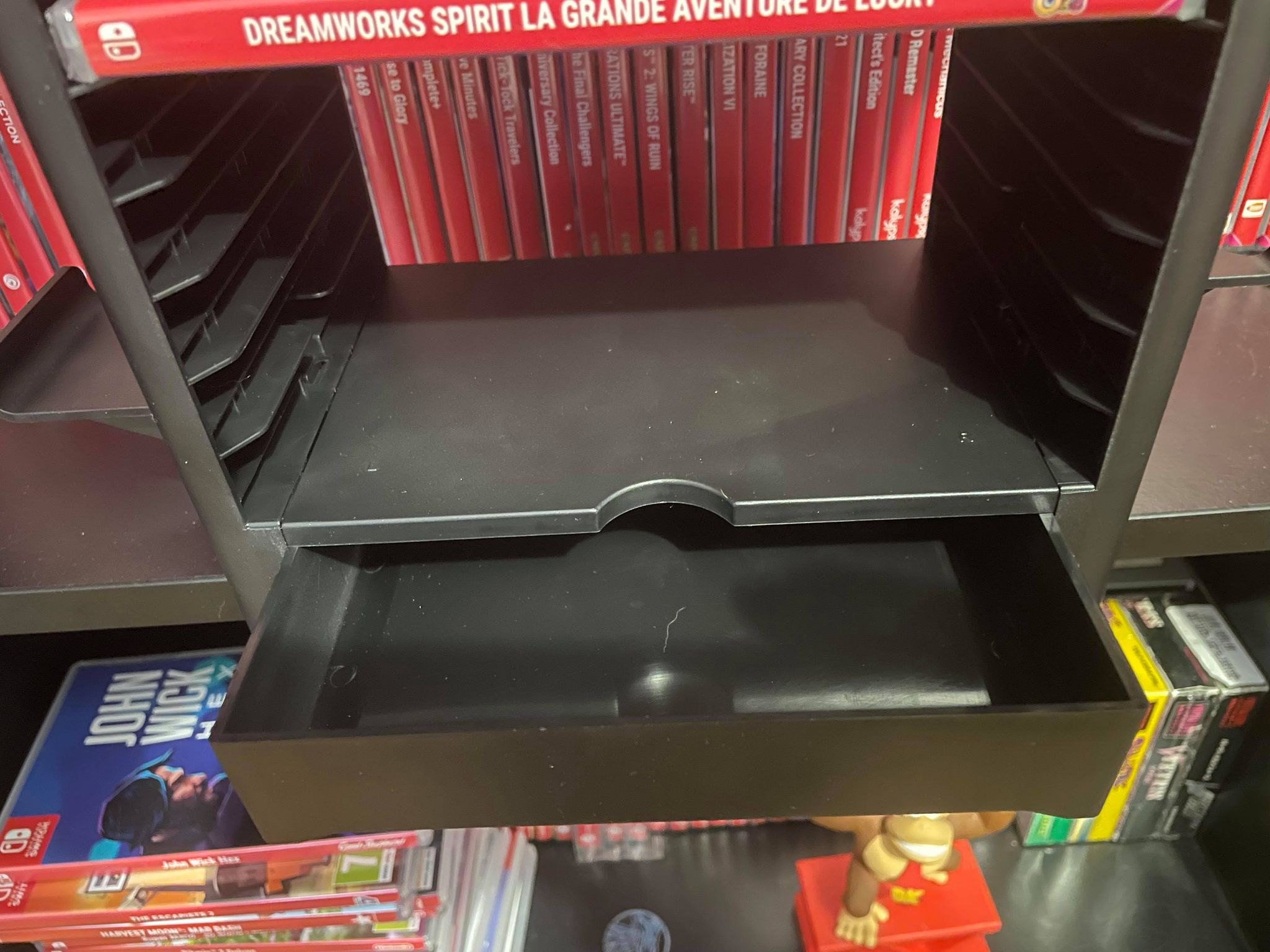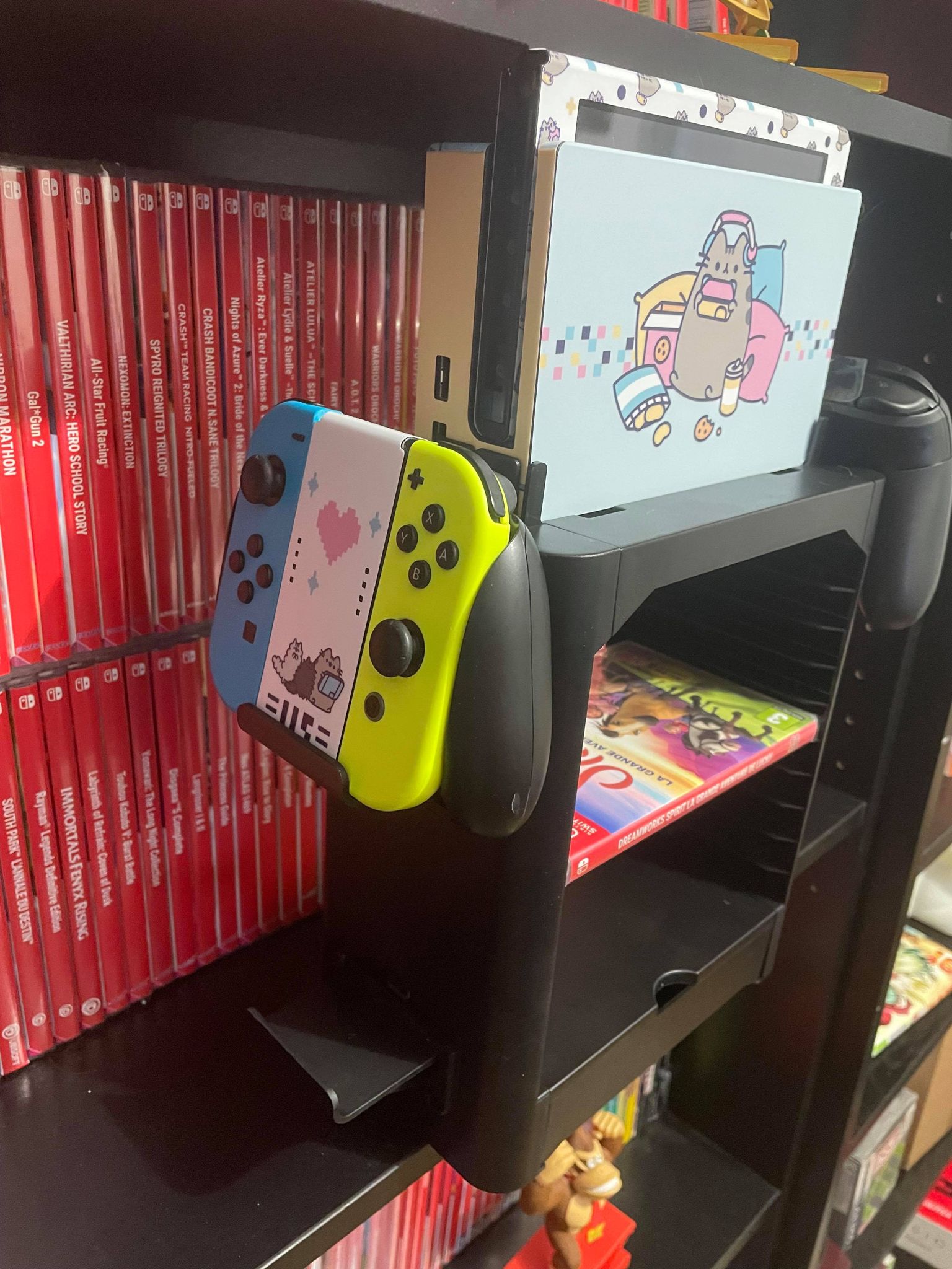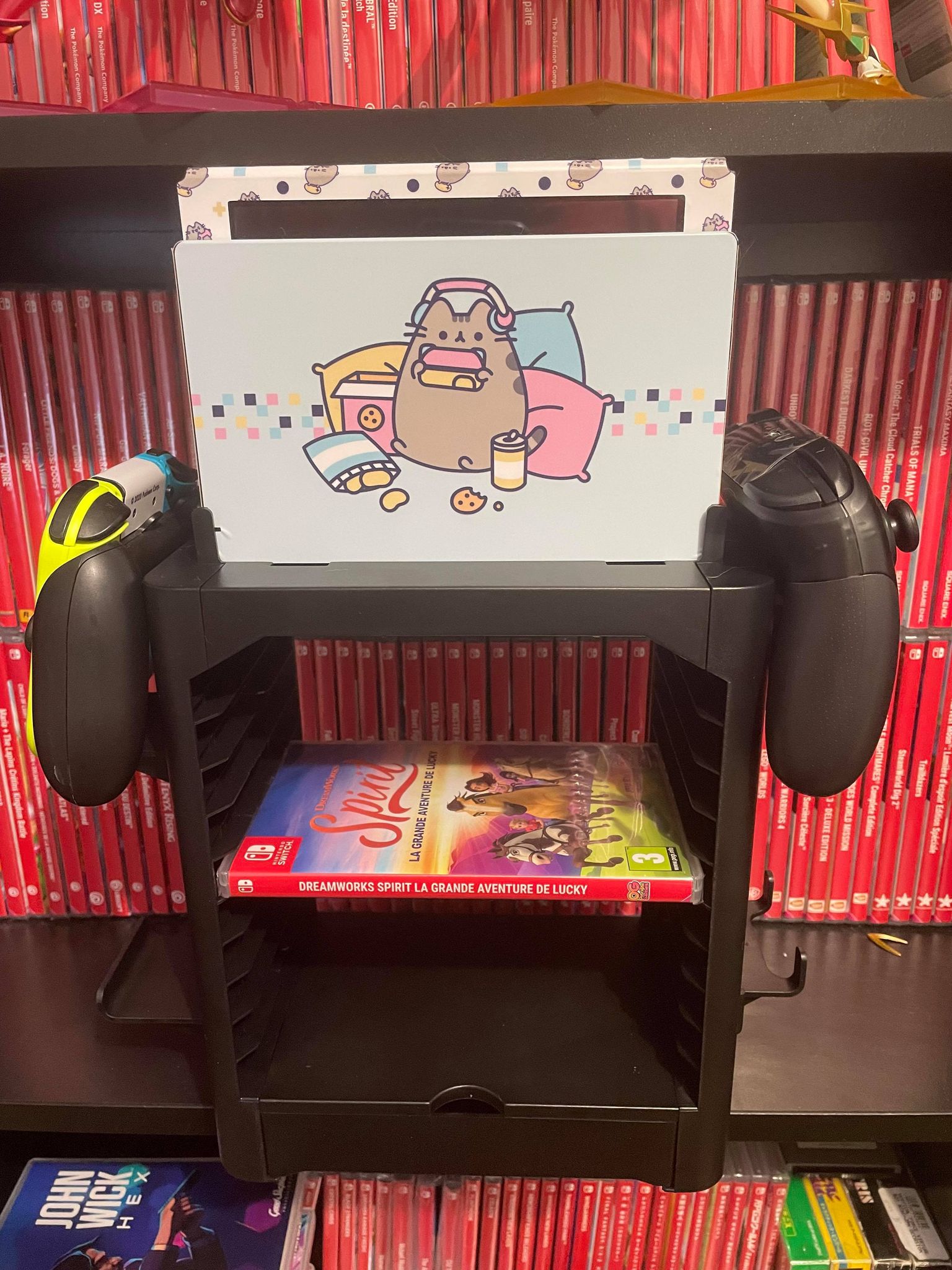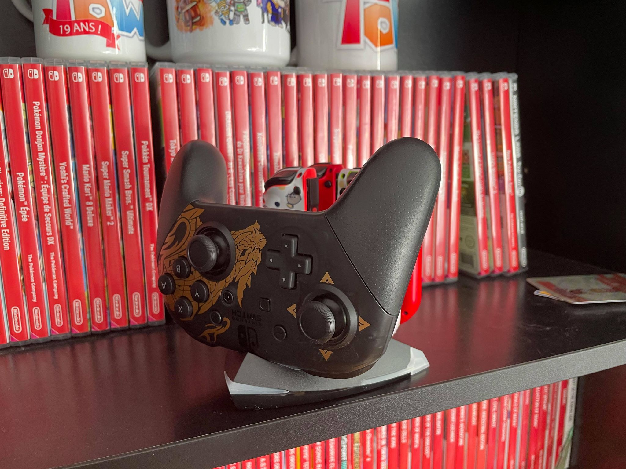 Premier constat, j’ai eu du mal à monter la bête. Presque 40 minutes et des instructions plutôt chiches et finalement non suivies. Une fois monté, l’objet fait son office. Le trône est bien mis en valeur, on peut ranger l’ensemble des affaires autour de cette tour, ce qui permet de ranger. À noter que la manette pro n’est pas forcement celle qui se glisse le mieux sur le côté. Le tiroir, un peu dur à ouvrir, permet de cacher quelques câbles disgracieux. Par contre, finalement, 10 jeux c’est un peu limite et ça sera surement le principal reproche de l’objet. A conseiller à ceux qui ont peu de jeux ou sont fans de l’eShop.