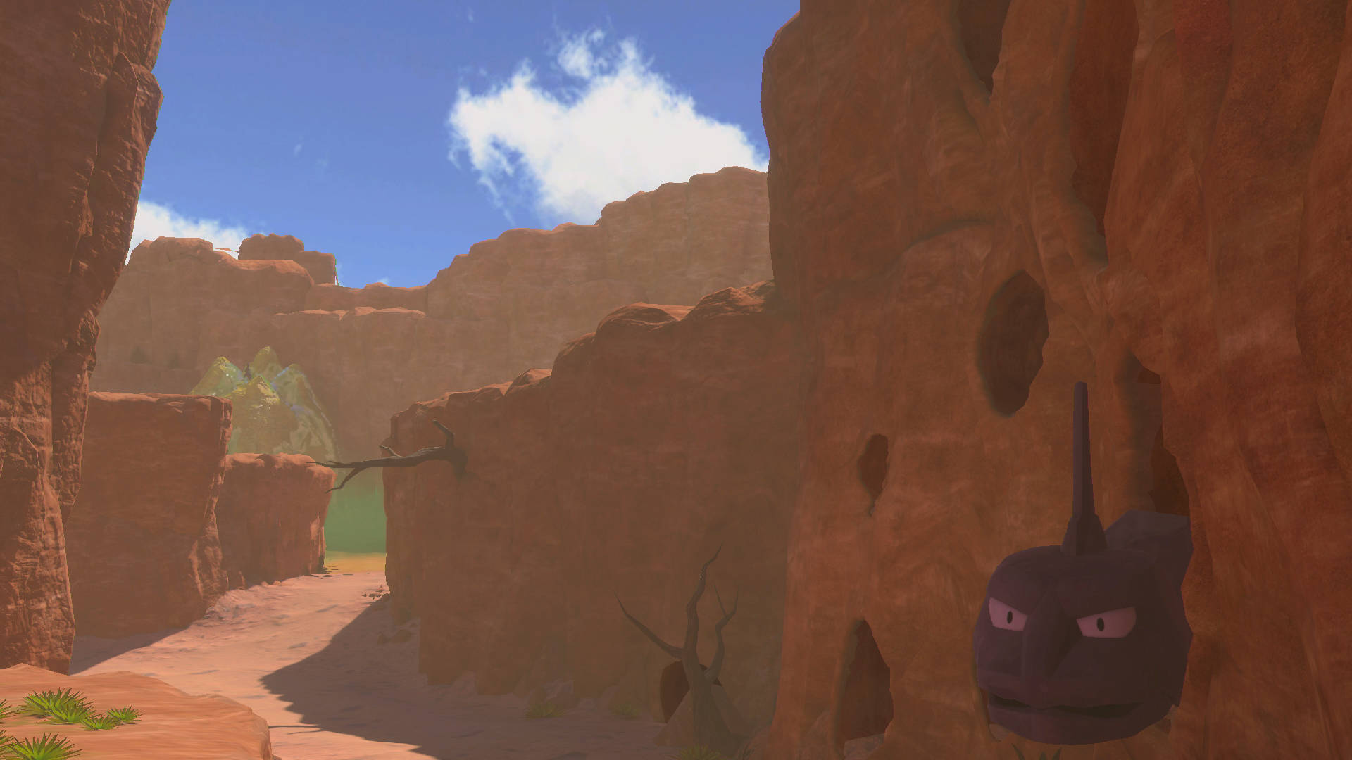 - Les Terres Désolées (jour et nuit) – Dans cette zone, vous parcourrez les terres sauvages d’Haptos, où souffle un vent sec provenant du désert. On y trouve des éléments singuliers, tels que des geysers ou des marais aux émanations toxiques. Ouvrez l’œil lors de votre exploration : certains Pokémon aiment se cacher sous terre ou dans les falaises rocheuses.