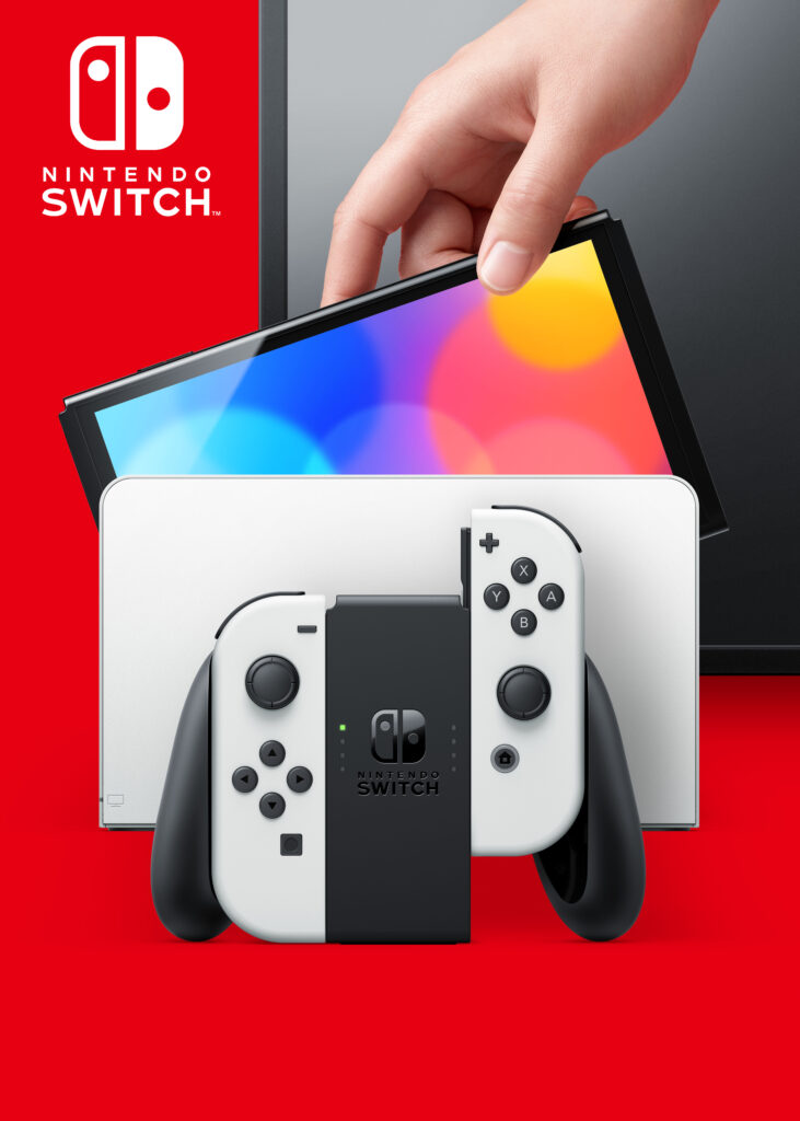 La Nintendo Switch (modèle OLED) possède des dimensions proches de celles de la Nintendo Switch mais dispose d’un écran OLED plus grand aux couleurs intenses et aux contrastes élevés. La Nintendo Switch (modèle OLED) dispose aussi d’un large support ajustable pour le jeu en mode sur table, d’une nouvelle station d’accueil avec port Ethernet pour un jeu en ligne stable, de 64 Go de mémoire interne et de haut-parleurs intégrés proposant un audio amélioré pour les modes nomades (portable et sur table). Tout comme la Nintendo Switch, la Nintendo Switch (modèle OLED) permet de jouer sur un téléviseur et de partager les manettes Joy-Con détachables pour s’amuser en multijoueur.