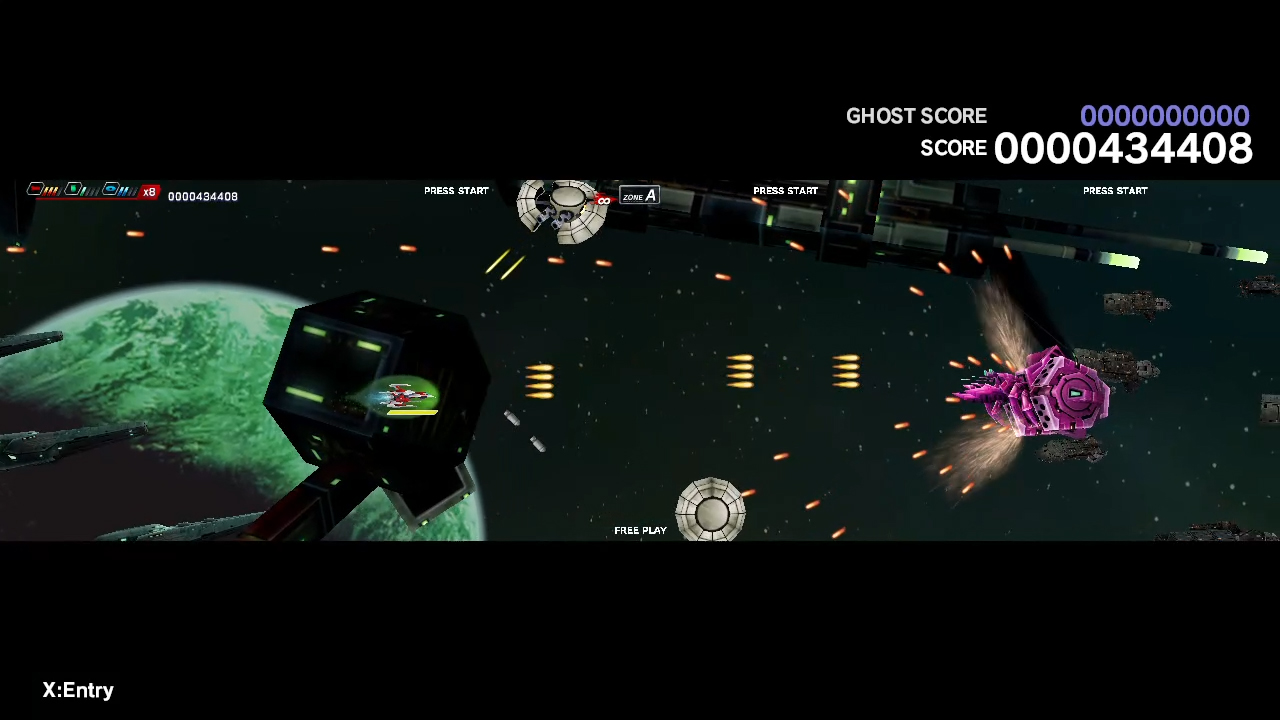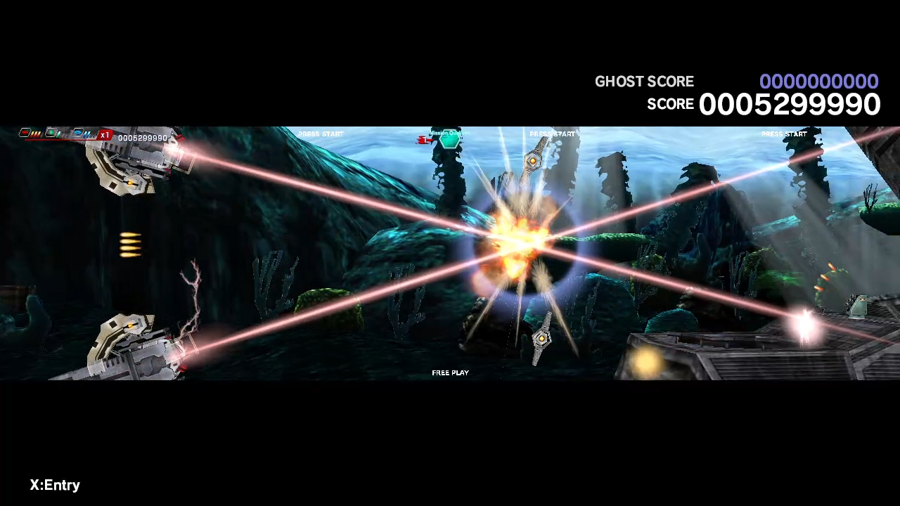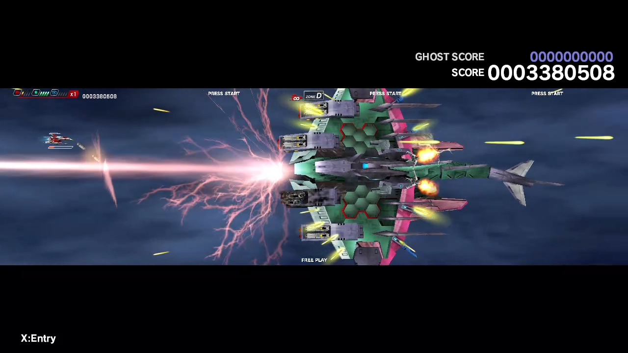 Une fois le jeu lancé, tout est fait pour rappeler l’expérience de jeu d’une borne, jusqu’au Free Play qui clignote tranquillement en bas de l’écran d’accueil. Cette version Ex+ nous laisse le choix entre quatre modes de jeu. Le premier, nous permet de revivre l’expérience proposée lors de sa sortie initiale sur PSP en 2009. Darius oblige, nous sélectionnons une voie parmi trois qui représente la difficulté à laquelle nous allons être confronté. Une fois ce choix effectué, nous pouvons choisir de démarrer avec un nombre fini de vaisseaux ou un mode entraînement qui offre une infinité de vies, parfait pour les débutants ou les joueurs qui souhaitent s’entraîner sur un boss situé plus loin dans le parcours.