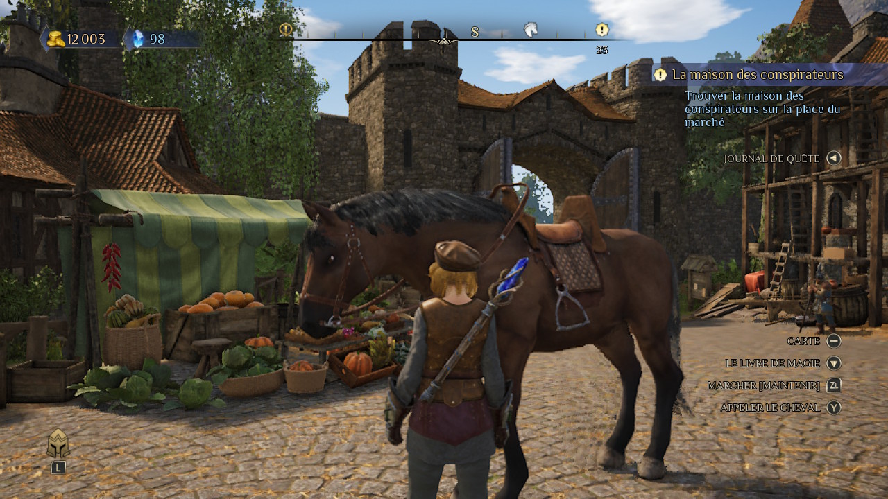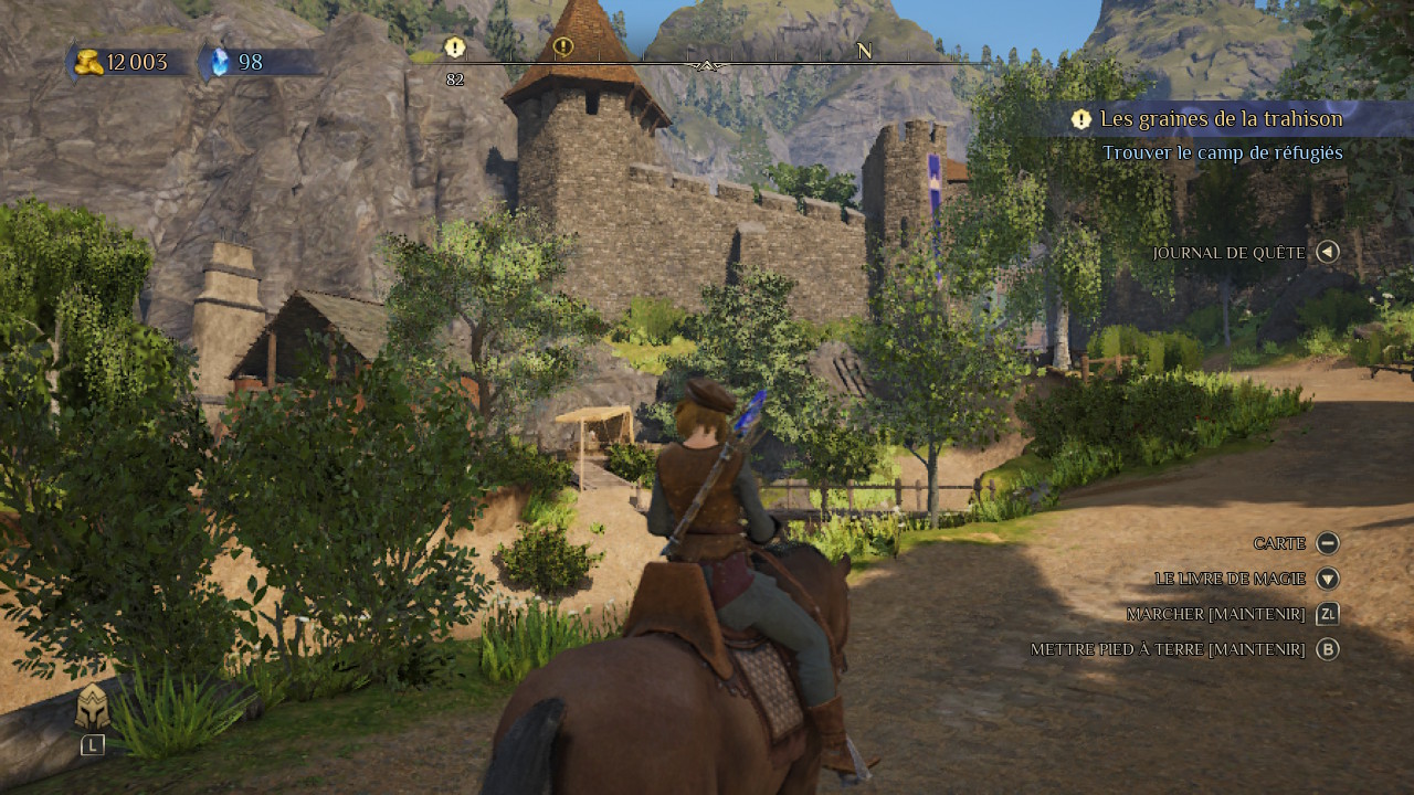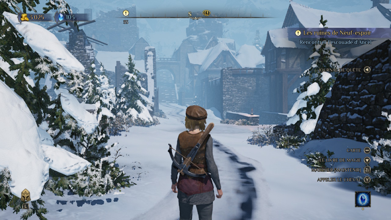 La grande nouveauté de ce nouveau King’s Bounty tient dans l’exploration, qui renonce à la traditionnelle vue de dessus au profit d’une caméra embarquée à même le dos de notre avatar ou de son destrier. Les terres de Nostria ont beau très vite révéler leurs limites – notamment des murs invisibles et des chemins très balisés -, ce monde semi-ouvert favorise grandement l’immersion au sein de l’aventure. En revanche ne disposons-nous pas de mini-map, mais d’un simple indicateur boussole nous orientant vers les points d’intérêts. Ce parti-pris, qui nous oblige à nous interrompre plus que de raison pour accéder à la carte via le bouton « + », casse le rythme de notre aventure. Autre point désagréable, notre monture : le gain de vitesse, peu visible, donne l’impression de déplacements particulièrement lents.