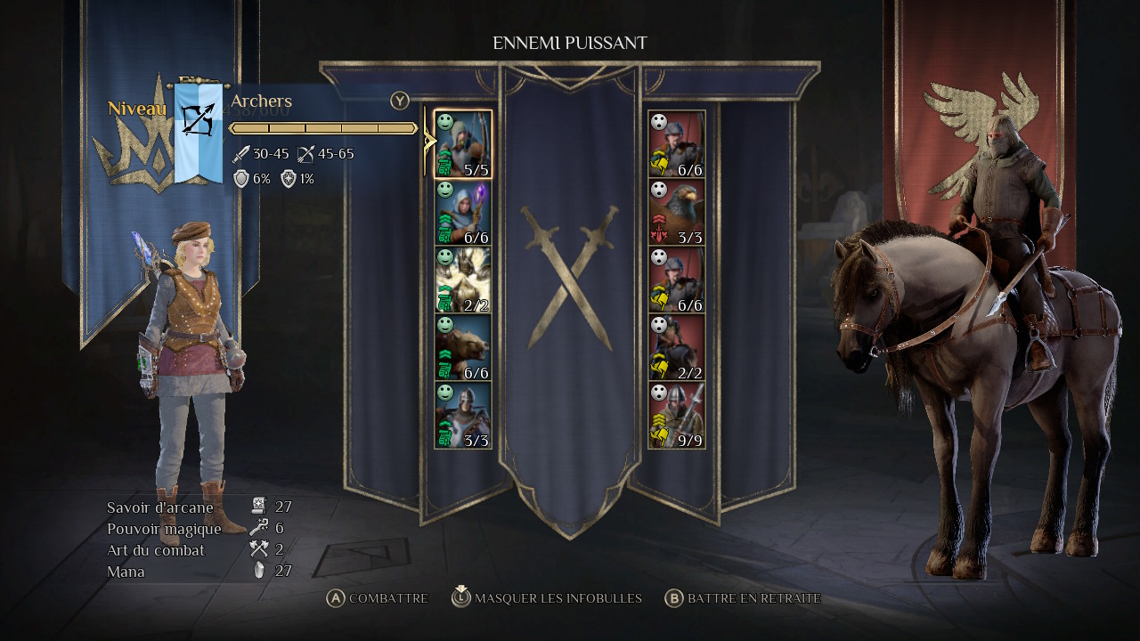 Notre choix de héros, au départ, revêt également toute son importance, aussi bien dans le déroulement des combats qu’au cours de nos pérégrinations. Chacun d’entre eux possède en effet des compétences spécifiques influençant de manière passive les batailles, ou activables lors des phases d’exploration. À notre portée également, la possibilité de lancer des sorts une fois par tour : qu’ils soient de type « attaque », « soins » ou « buff/debuff« , ils piocheront dans notre réserve de mana et toujours changeront, l’issue du combat. De ces différentes composantes résultent des conflits très tactiques, qui auront tôt fait de sanctionner les joueurs imprudents, récompensant à l’inverse ceux d’entre nous qui chercheront à optimiser leurs troupes et leur positionnement.