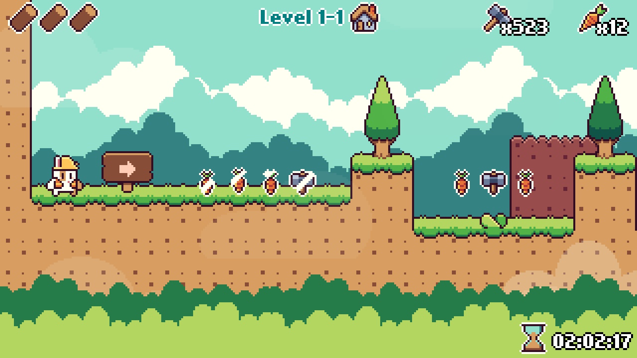 Première chose à noter, le jeu se prend très facilement en main, mobilisant seulement deux touches : « B » pour sauter et « Y » pour lancer des marteaux. Sans surprise, la croix directionnelle ou le joystick servent au déplacement de notre joyeux compère, qui n’a qu’un but, élémentaire : récolter au sein de chaque niveau les trois bûches nécessaires à la réparation d’une passerelle, afin que chacun puisse rentrer chez soi. D’autres items à collecter consciencieusement, conformément au genre, parsèment notre chemin : les carottes, qui nous octroient aléatoirement un bonus de protection dès le 100ème légume ramassé, les marteaux destinés à casser les dents des ennemis croisés en route – à stocker sans modération donc, pour ne jamais tomber à court -, mais aussi des pièces d’armure, casque, gants et lunettes, correspondant à trois paliers de défense. Tout un arsenal qui ne sera pas de trop face à la faune locale, de même que le tir chargé qui permet de projeter plus loin nos marteaux.