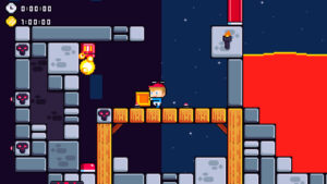 Un bon plate-former passe par des niveaux bien construits, et c’est plutôt réussi. Les niveaux se passeront soit à l’horizontal, soit à la verticale, ou un mélange des deux. Les niveaux sont très courts (une minute maximum), accompagnés d’un chrono. Si vous réussissez à faire en-dessous du temps donné, vous obtenez une médaille. Les pièges sont simples, mais leur placement et le minutage d’activation sont bien pensés pour gêner le joueur. Pour les monstres, ils ont des attaques différentes. Cependant, ils se ressemblent tous et sont quasiment inoffensifs.