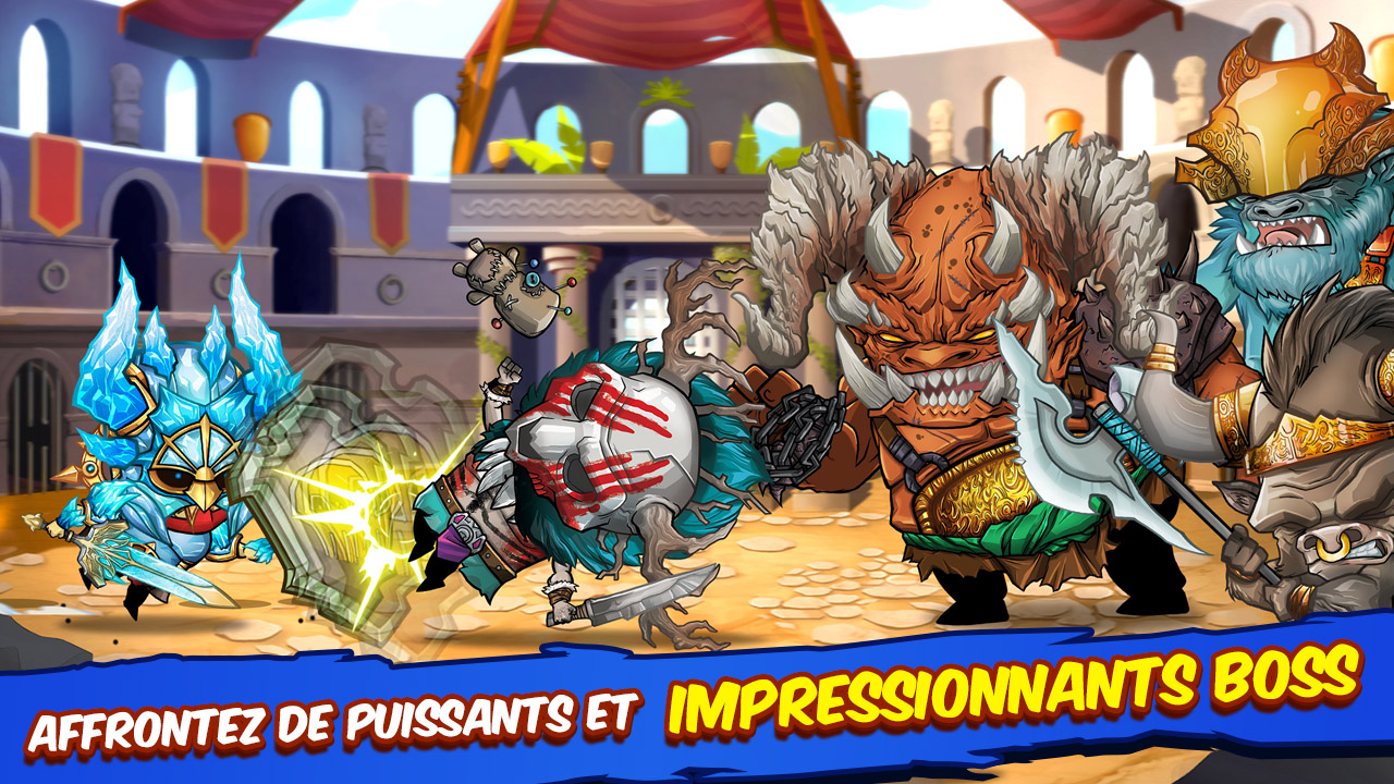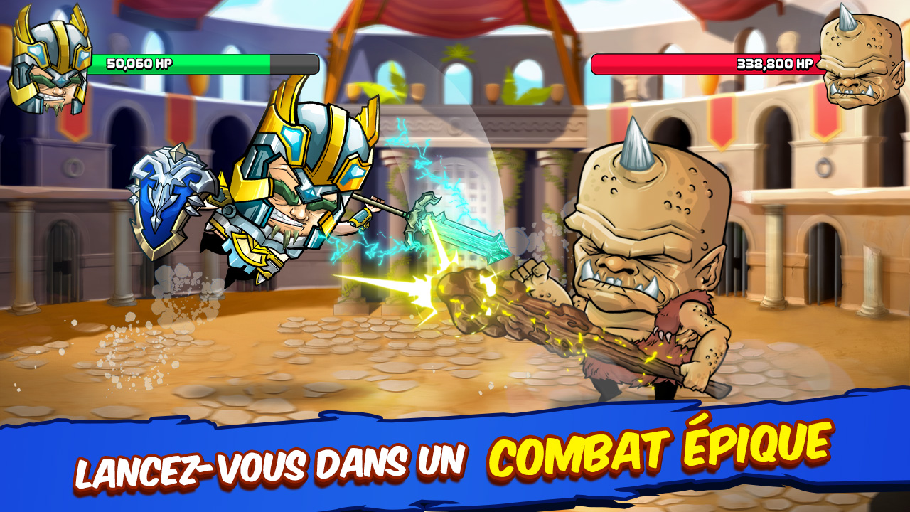 Comme de coutume dans ce genre de jeu, nous aurons sans cesse besoin de se renouveler au niveau de l’équipement. Pour cela rien de plus simple, il suffira juste de gagner les combats et donc de précieuses pièces d’or. Ces jolis petits deniers nous serviront ensuite via un menu à acheter des pièces d’équipement. Mais attention, ici nous avons affaire à des caisses de loot, ainsi il faudra donc cumuler notre or pour ouvrir l’un des trois coffres et espérer en retirer une magnifique arme ou armure de niveau légendaire. Plus notre équipement sera puissant, plus il influera sur notre niveau de puissance. Niveau qui servira bien évidemment à occire plus facilement nos adversaires. Pas d’inquiétude à cela, il suffira soit d’acheter ses pièces dans des coffres ou alors de battre des boss ou compléter des arènes spécifiques pour avoir accès à un ou plusieurs coffres. Autre astuce, accumuler de l’or pour améliorer son équipement en le faisant grimper de niveau via bien sûr une certaine somme qui ne cessera d’augmenter à chaque palier. Ainsi, grâce à cela, notre personnage sera plus puissant et aura plus de facilité face à ses adversaires de plus en plus coriaces. Mais attention si notre puissance d’équipement augmente, il en est de même pour celle de l’ennemi.