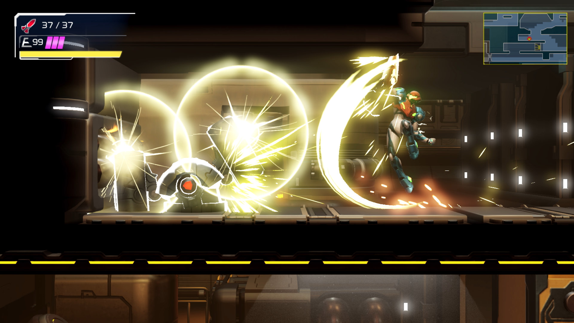 Si l’histoire démarre sur les chapeau de roues, les power-ups aussi s’enchaînent très vite, et les nouvelles mécaniques de gameplay se mettent en place avec une fluidité naturelle. Le contre rapide s’apprend vite et devient dès lors indispensable. L’EMMI gagne vite le statut d’ennemi Nemesis, que nous apprenons à craindre, malgré son petit chant très mimi qui reviendra hanter vos nuits.