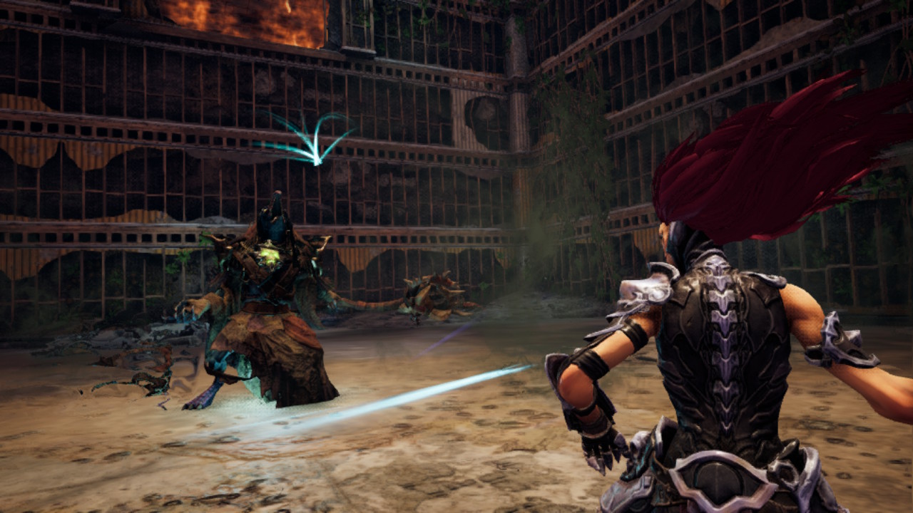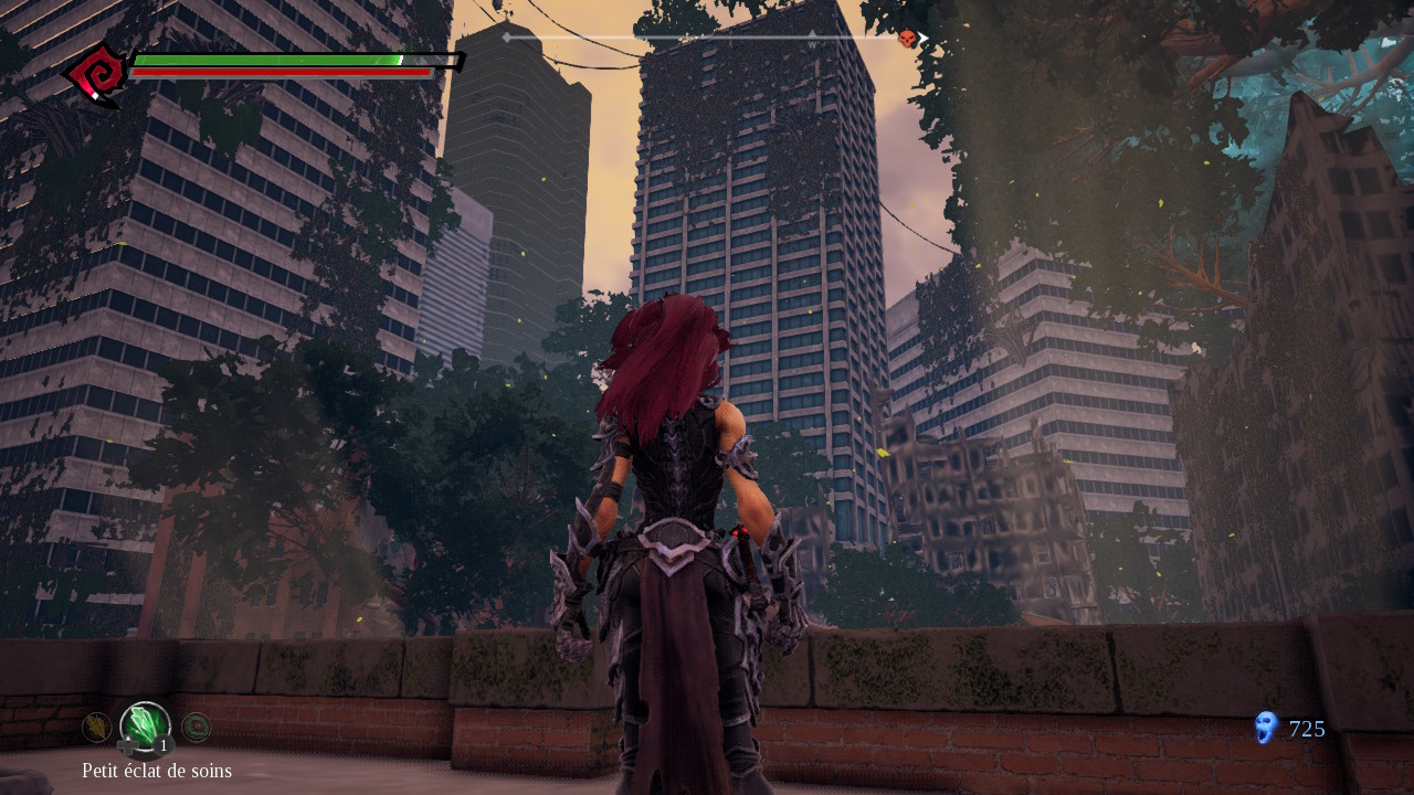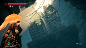 Ainsi notre fidèle cavalière va s’aventurer dans des paysages post-apocalyptiques totalement ravagés par la guerre entre anges et démons. Les endroits que nous traversons sont jalonnés de débris d’immeubles, de véhicules délabrés et de carcasses de bâtiments semblant sur le point de s’effondrer à tout moment. Autant de vestiges montrant bien le temps passé et la violence des combats. Le dépaysement est présent. D’autant plus que maintenant nous sommes face à un immense Metroidvania. Comprenez par-là que toutes les zones seront interconnectées et que plusieurs chemins seront bloqués par des obstacles face auxquels nous devrons revenir avec le pouvoir adéquat. Nous perdons donc ici le monde ouvert de l’épisode 2 et nous retrouvons alors dans un immense donjon. Le tout est très bien structuré même s’ il nous arrive de nous perdre et de chercher notre chemin faute de l’absence de carte. Nous aurons pour seul indicatif de direction une boussole à la manière d’un Skyrim. D’autant plus que dans la grande tradition des metroidvania, Darksiders 3 propose moult embranchements et salles bloquées. Il aurait été donc préférable d’inclure une carte pour repérer ces centres d’intérêts pouvant conduire à des objets et parfois même des boss optionnelles.