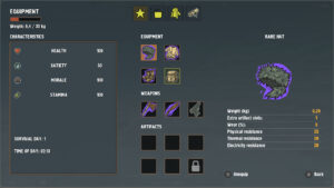 Bien que proposant deux voyages quelque peu différents, que ce soit au niveau du scénario finalement peu présent, de la différence de la carte ou encore dans les objets et constructibles un poil diversifiés selon son choix, le jeu se veut répétitif et court. En effet, la carte proposée est petite, si vous voulez en faire le tour complètement, une bonne heure sera suffisante. Ici tout est rapide, il suffit de récolter nos ressources, construire, aller d’un point A à un point B et le tour est joué. Quelques atouts viennent tout de même enjoliver quelque peu le soft, la présence d’artefacts pouvant booster nos caractéristiques ou encore les ennemis devenant de plus en retors au fur et à mesure des jours passés à survivre. D’ailleurs il est à noter que le titre propose tout de même des trophées à débloquer via des missions secondaires et des succès. Rien de bien compliqué, construire telle ou telle choses, ramasser 50 pierres ou encore survivre un jour de plus. Tout cela permettra d’engranger des points qui seront à répartir dans nos caractéristiques, enfin on essaiera, car après tout de même une dizaine d’heures nous n’avons pas réussi une seule fois à utiliser nos points. Aucune option ou fenêtre venant nous indiquer qu’il est possible de le faire.
