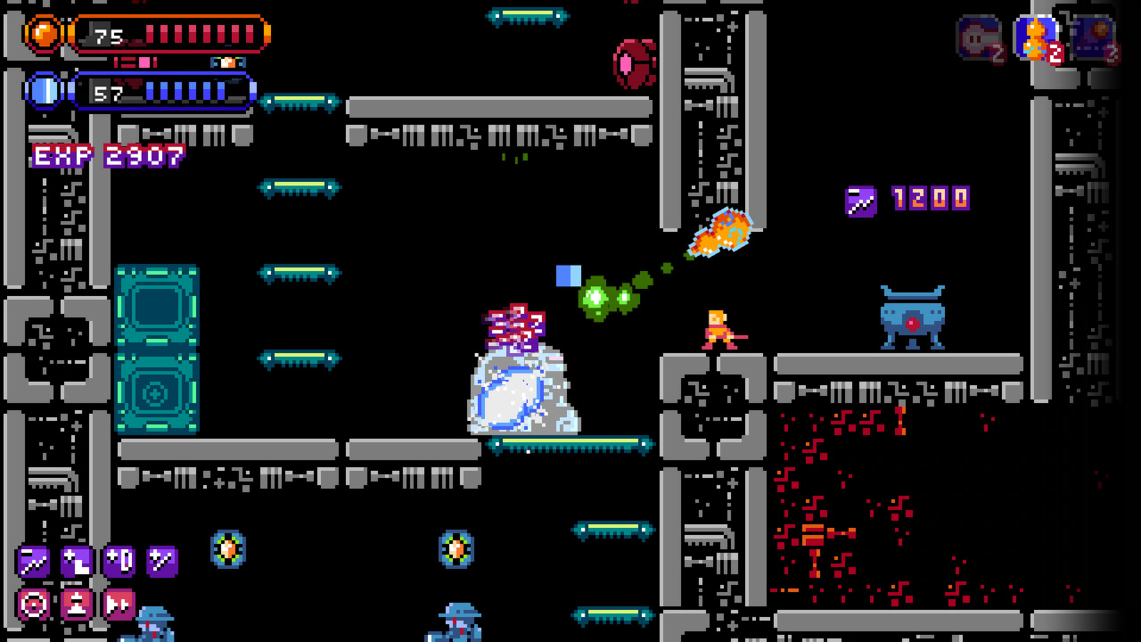 Le level-design est très facile à comprendre et nous ne nous perdons jamais dans des méandres qui n’existent, de toute façon, pas. Tiens je ne peux pas atteindre cette plateforme, oh la la, il va me falloir débloquer le double saut pour y parvenir… Ce n’est pas mauvais, c’est juste facile, mais pour le prix, c’est tout à fait acceptable. Il en va de même pour les ennemis et les boss que nous rencontrons. Une fois leur schéma compris, ils ne nous posent pas vraiment de problème. Nous nous rendons compte très vite aussi de ce que les développeurs de Bitca ont souhaité mettre en place à tel ou tel endroit. Tiens, une ligne de robot, le laser sera très efficace…
