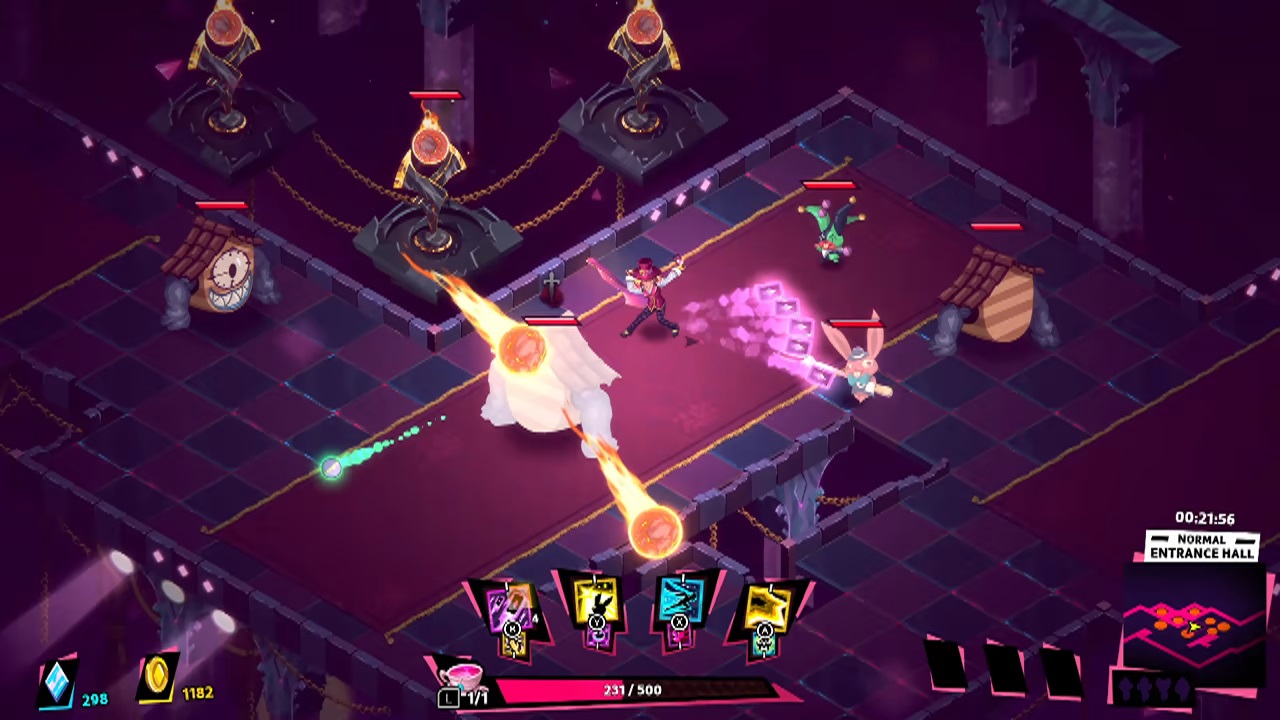 La vue et le gameplay font très rapidement penser à Hadès, mais tout est différent dans Dandy Ace. Pour commencer la base du gameplay, elle se base sur les cartes. Il y a 3 types de cartes : rose pour l’attaque, jaune pour les pièges et bleu pour les mouvements. L’autre info à connaître, c’est que vous pouvez avoir 4 cartes à la fois en main. Et à vous de choisir sur quelle touche vous allez binder la carte. Autre chose importante c’est que chaque carte peut en avoir une secondaire, par exemple, la carte rose de base c’est les 5 as, ce sont 5 cartes qui sont lancées sous forme de cône devant vous, si vous le couplez avec la carte de bulle d’eau et bien ça va déclencher une bulle d’eau en plus, vous pouvez alors mixer les cartes comme vous le souhaitez. Des bulles qui empoisonnent ? Des coups de poing qui infligent de la brulure ? Un piège qui immobilise en plus ?